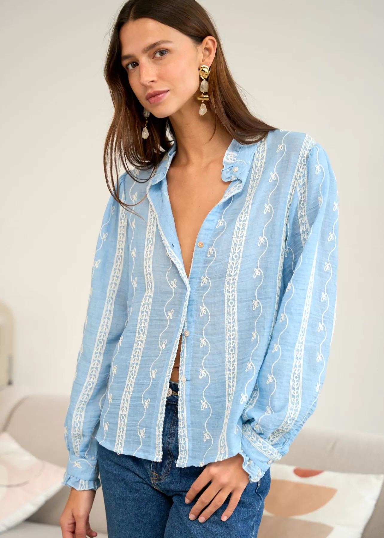 – Blouse brodée en viscose – Manches longues – Col rond volanté – Patte de boutonnage à l’avant – Longueur : 56 …