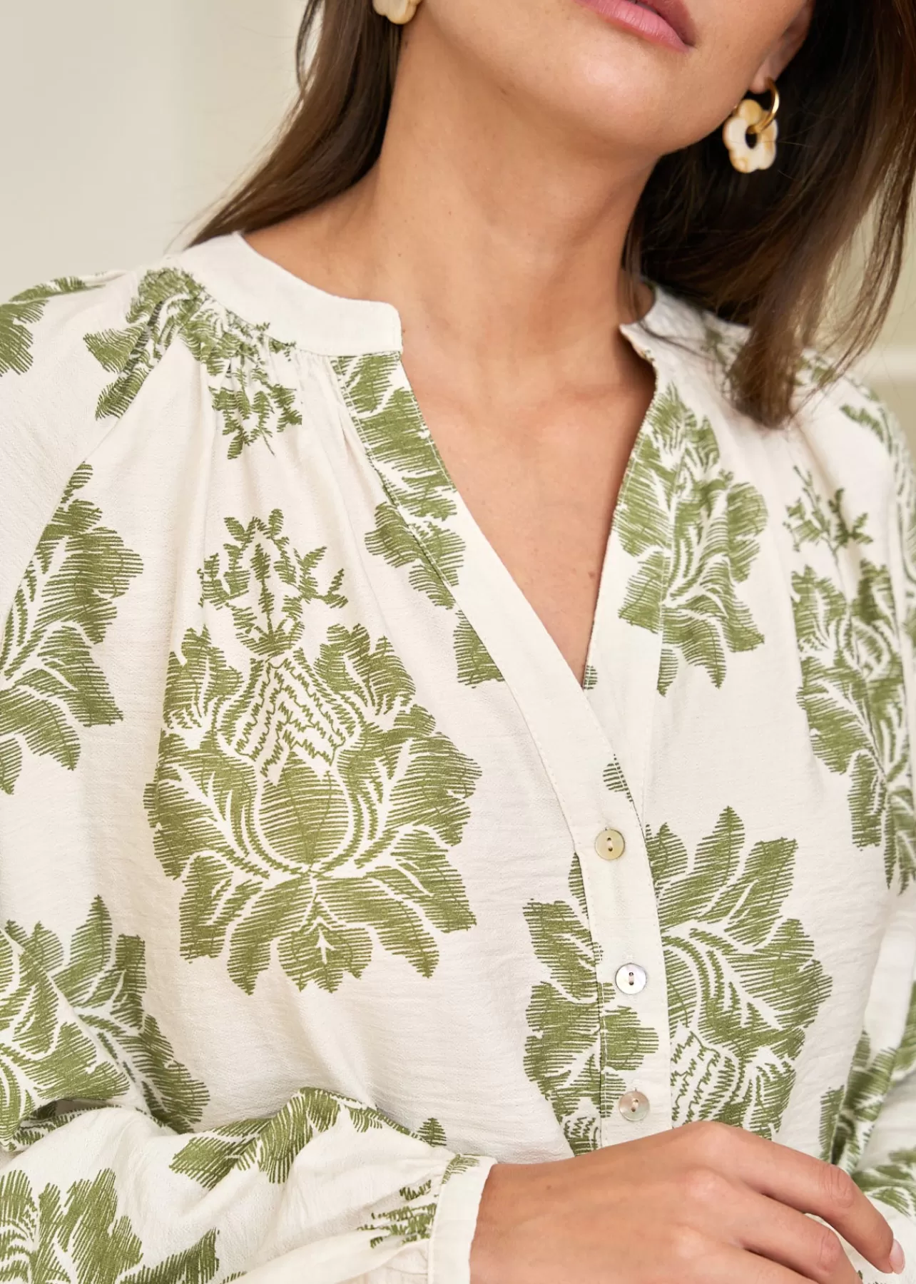 – Blouse imprimée- Manches longues- Col rond- Élastiquée au niveau du col – Patte de boutonnage à l’avant et aux m…