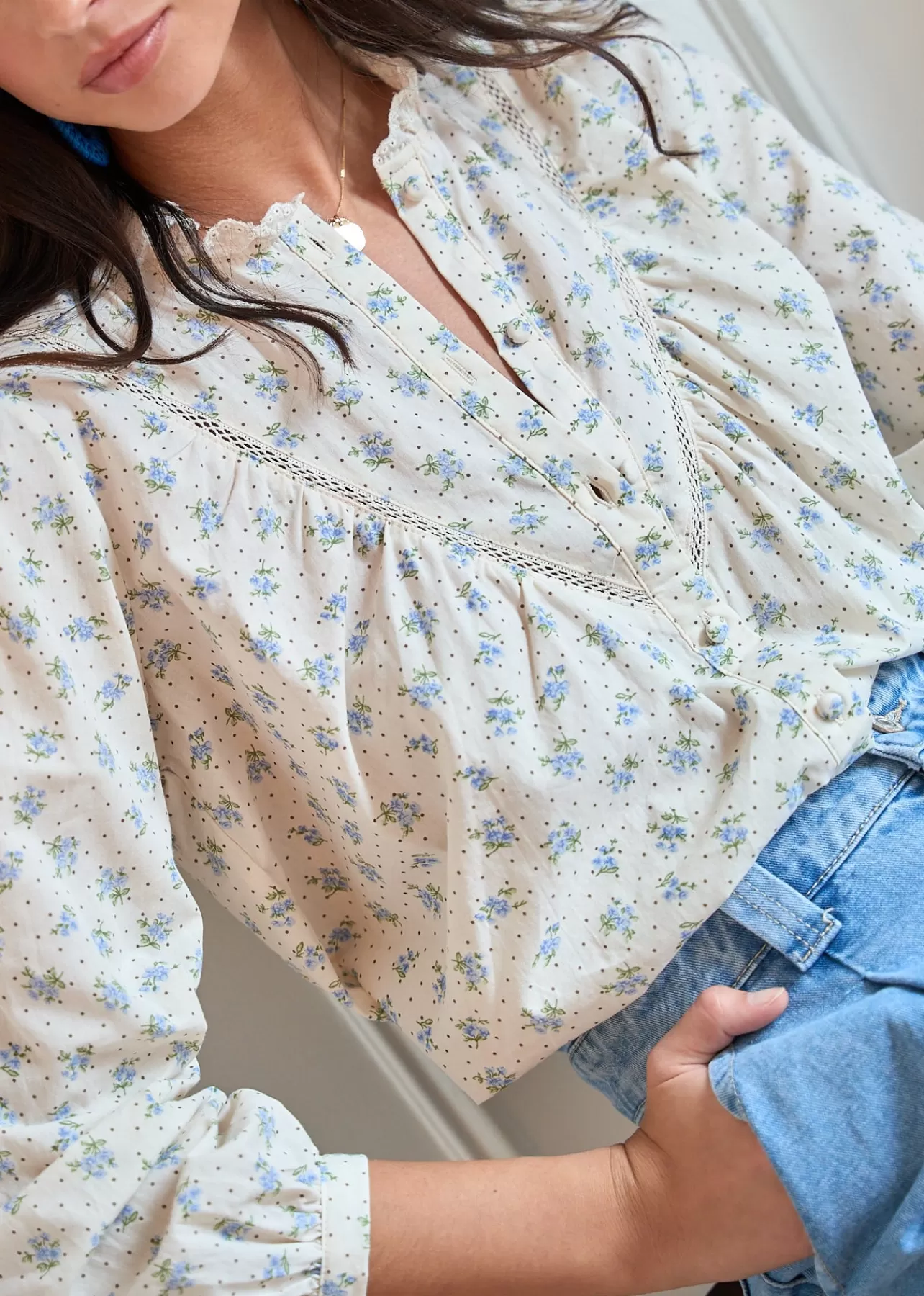 – Blouse imprimée en coton- Manches longues- Col rond- Détails en dentelle sur le devant au col- Patte de …