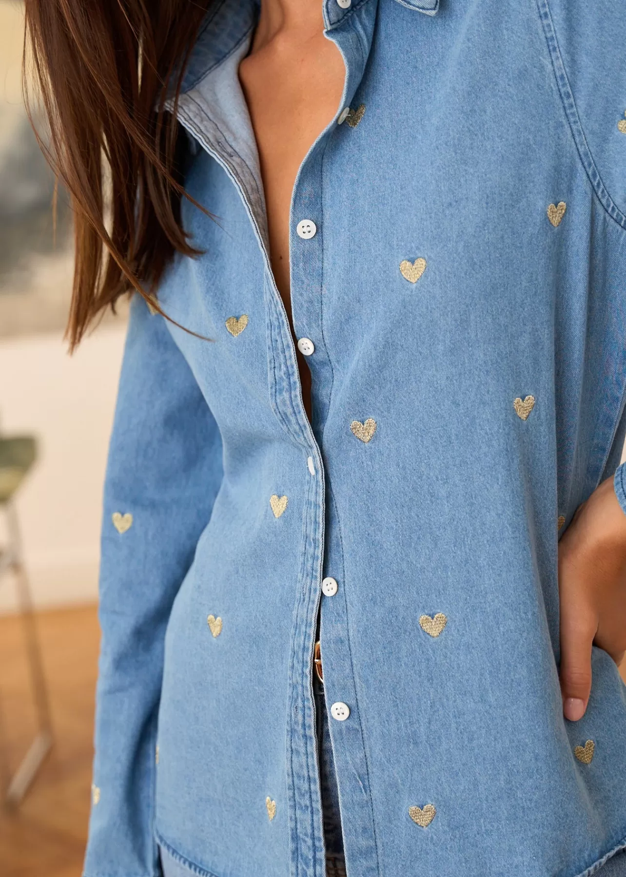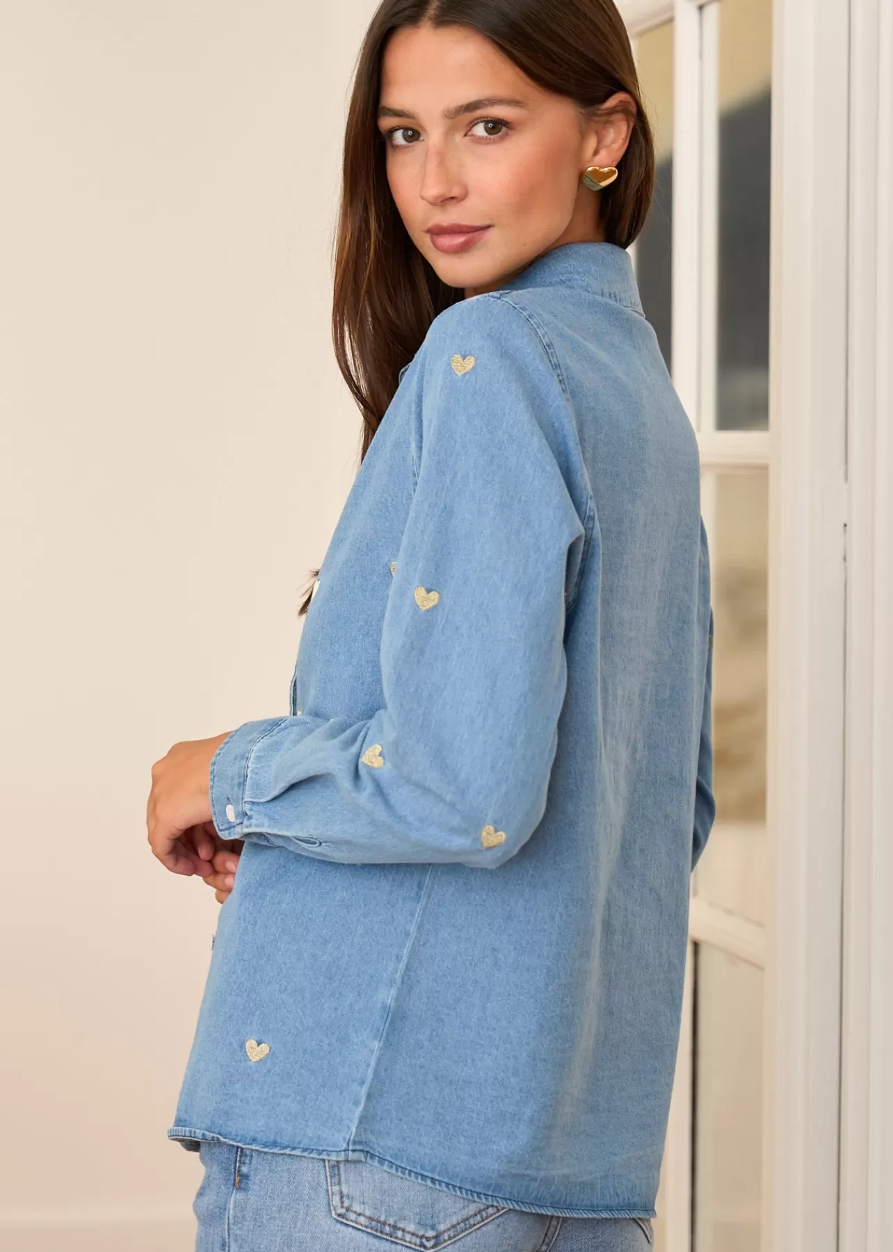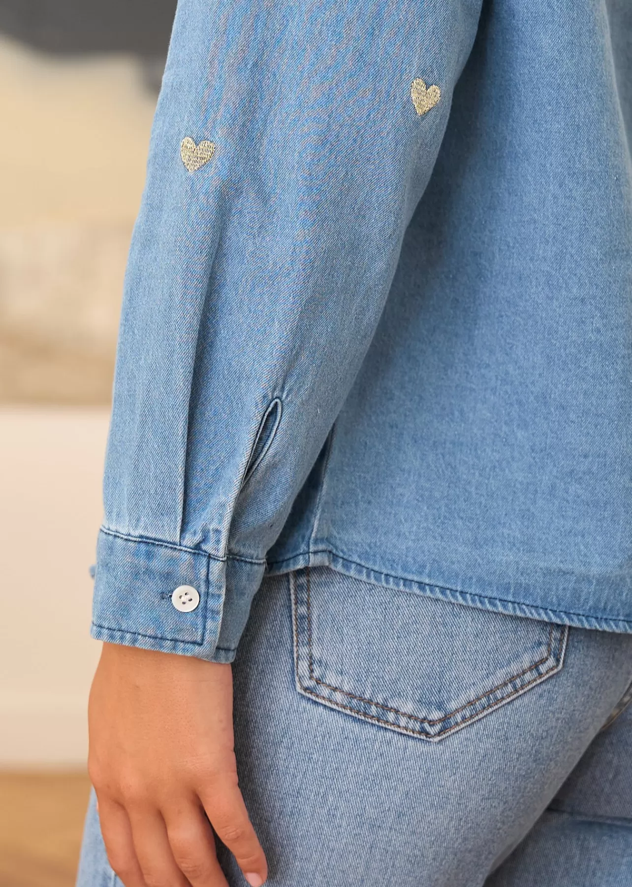 – Chemise denim en coton- Col classique- Coeurs brodés- Patte de boutonnage à l’avant- Poignets boutonne…