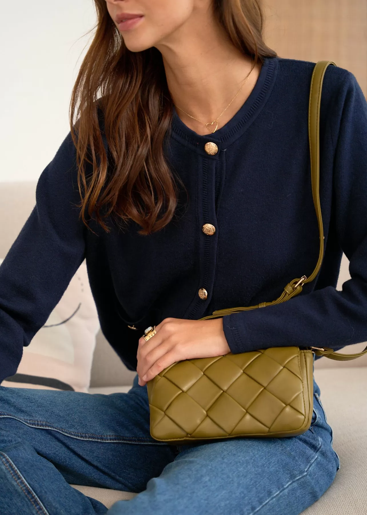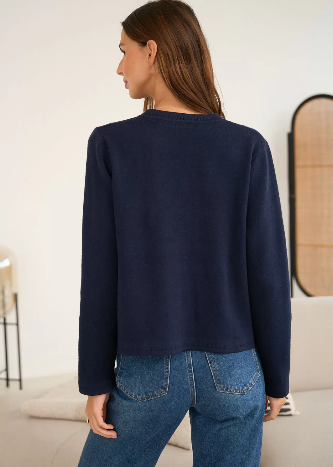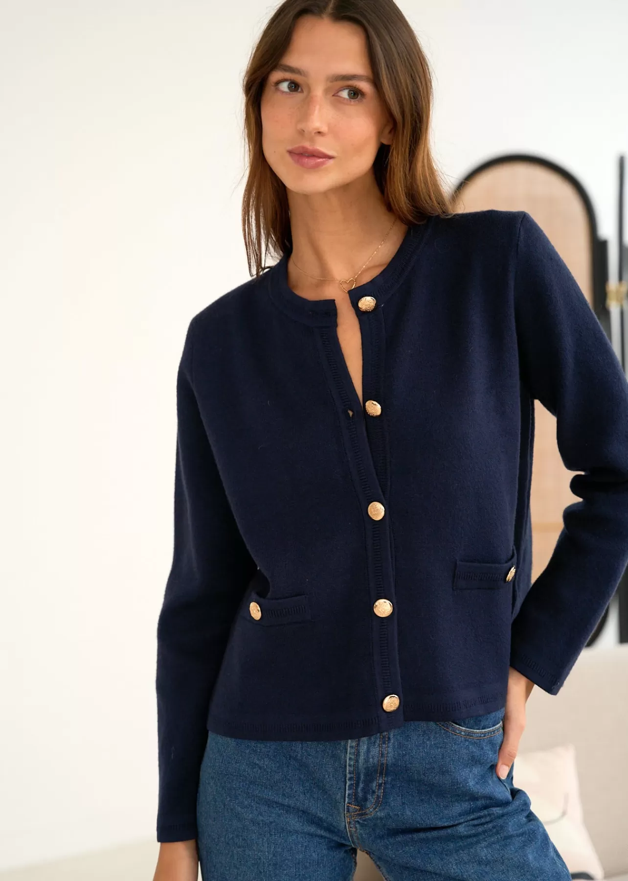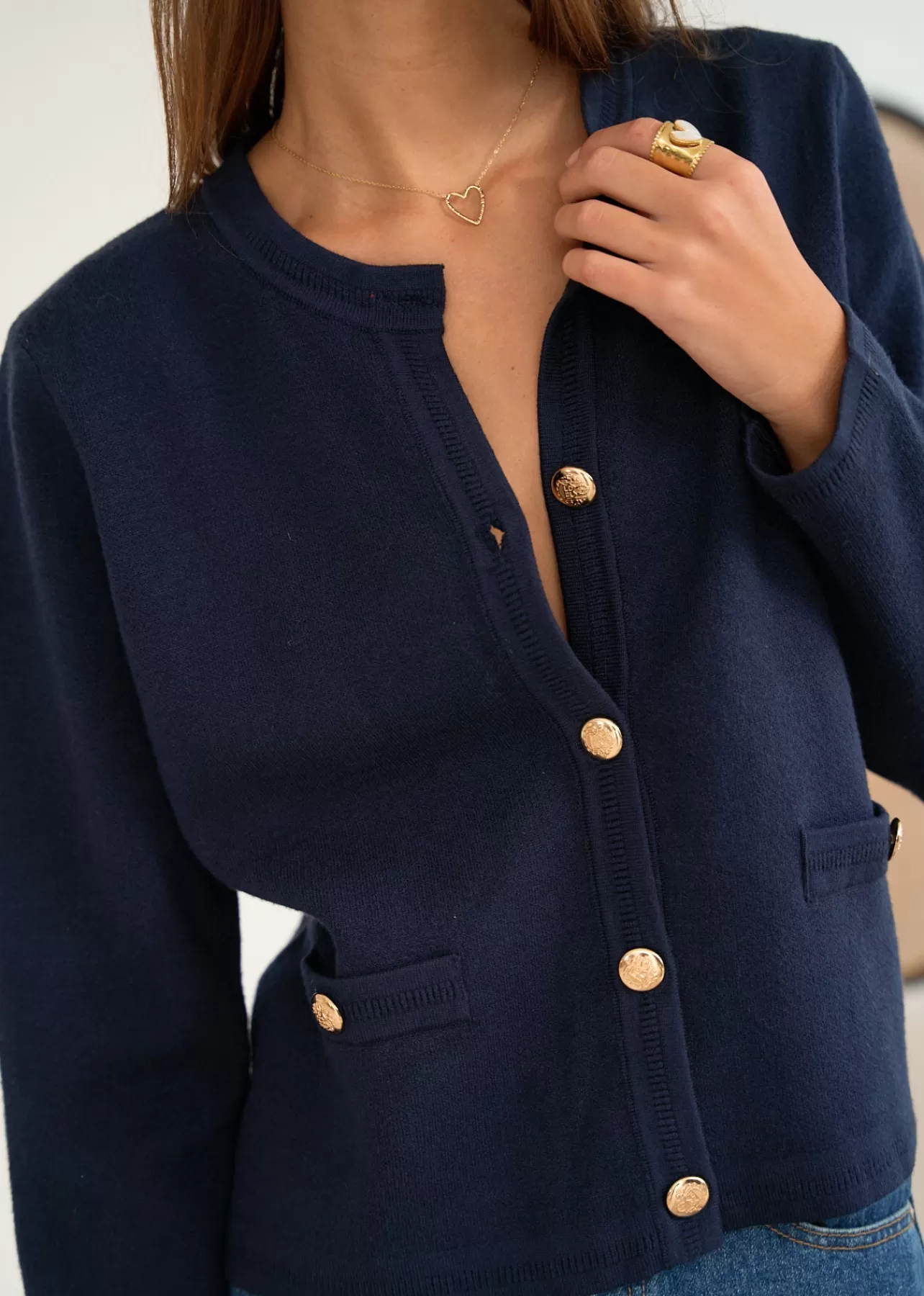 – Gilet manches longues en viscose – Patte de boutonnage à l’avant – Boutons dorés – 2 fausses poches plaquées a…
