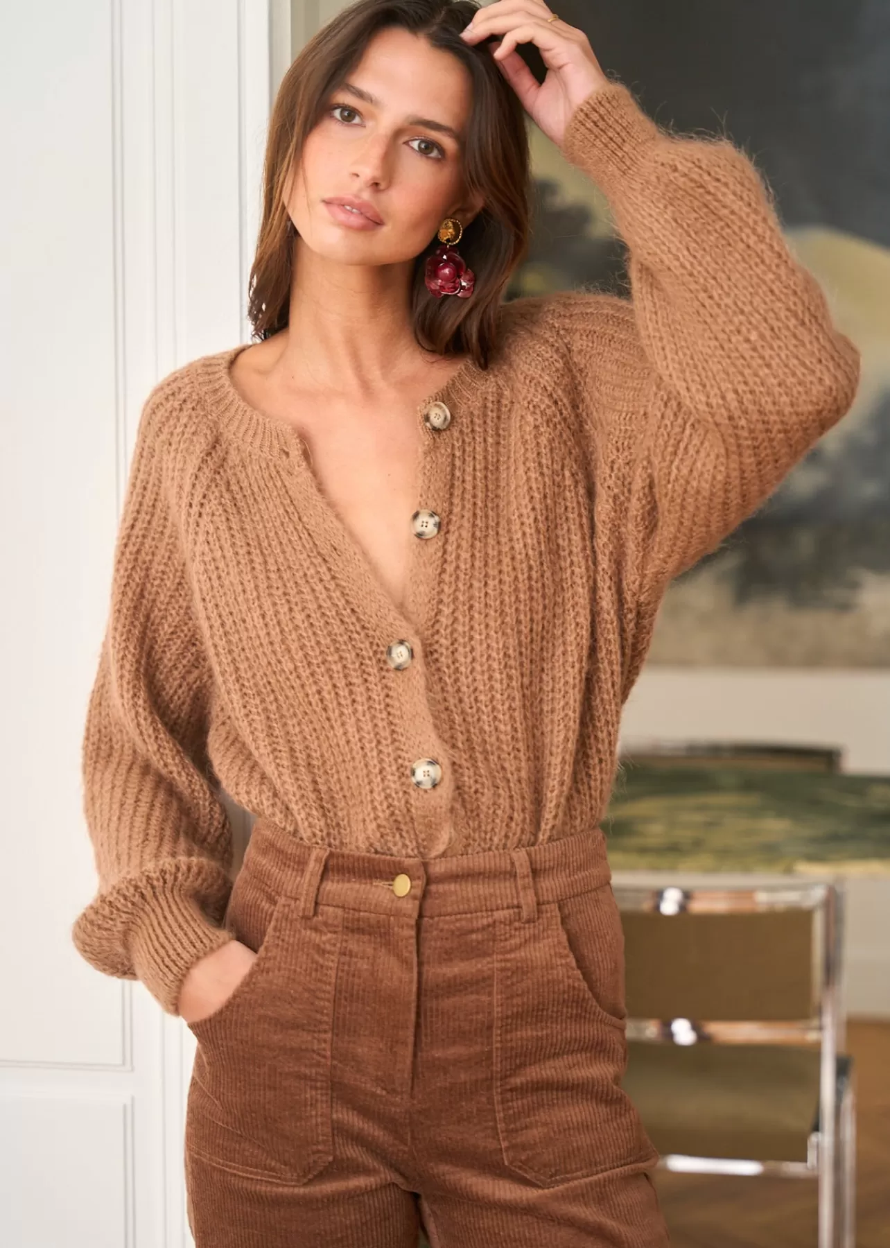 – Pull manches longues en mohair- Col rond – Patte de boutonnage au devant- Longueur : 53 cm (T.U) Youlia mesure 1m76 e…
