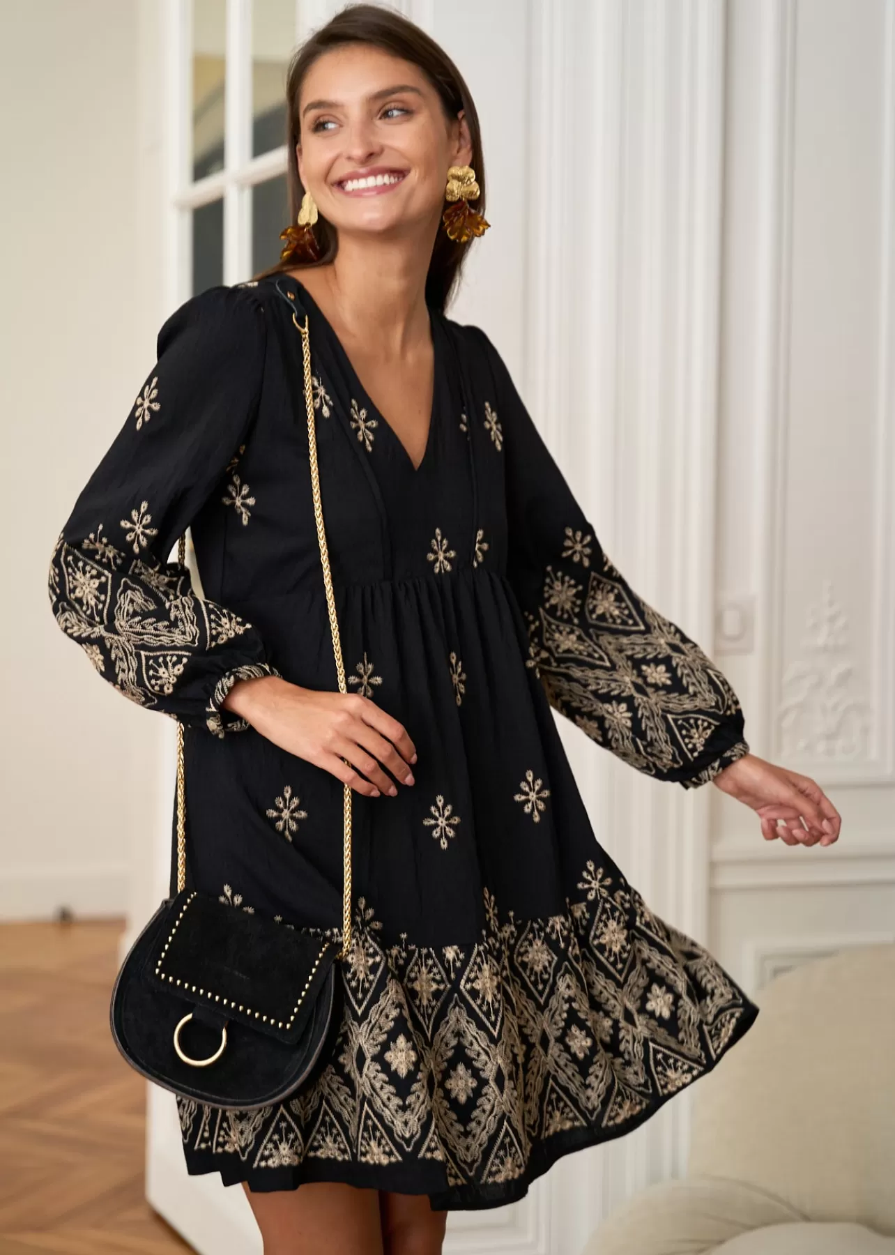 – Robe courte brodée en viscose- Manches longues- Encolure en V- Patte de boutonnage aux poignetsn- Doublée…