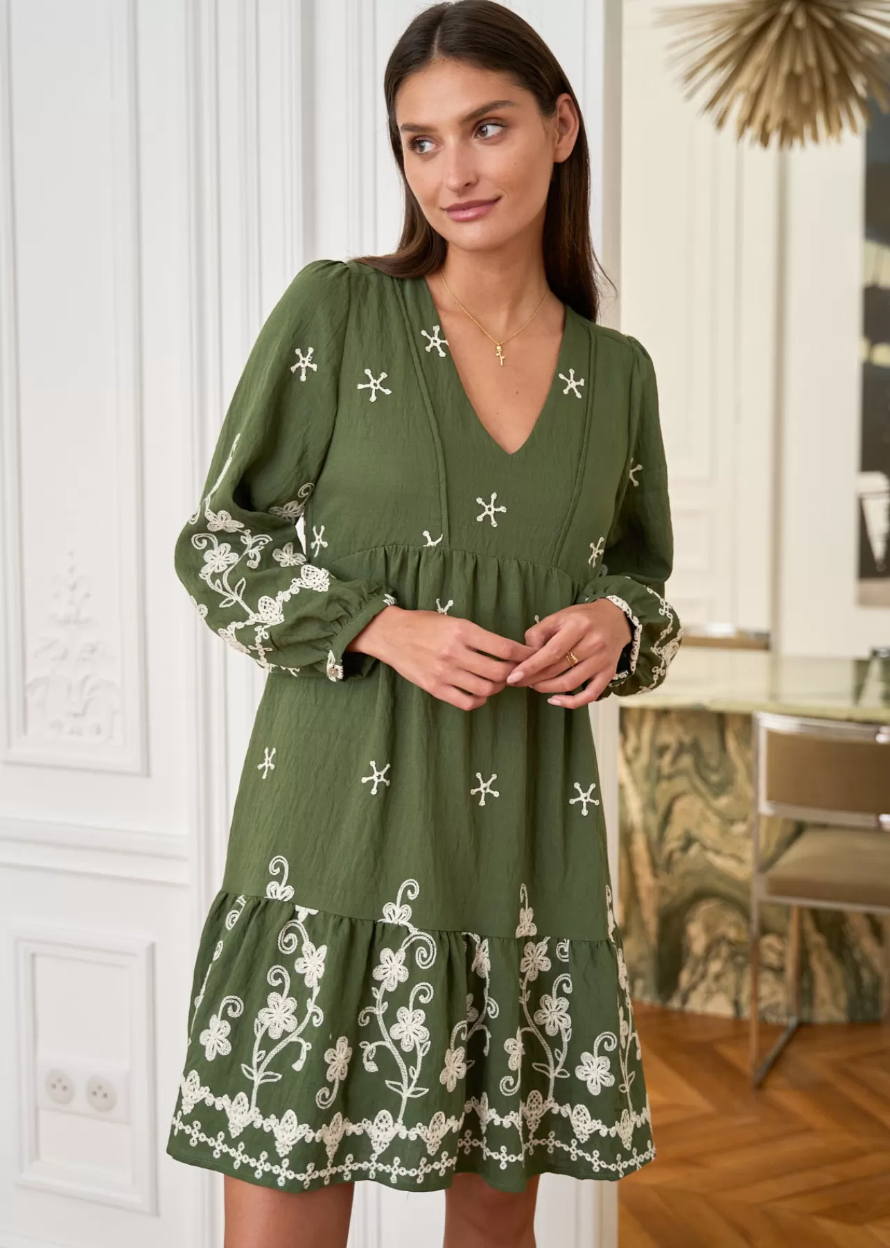 – Robe courte brodée en viscose- Manches longues- Encolure en V- Poignets boutonnés- Volantée au basn- D…