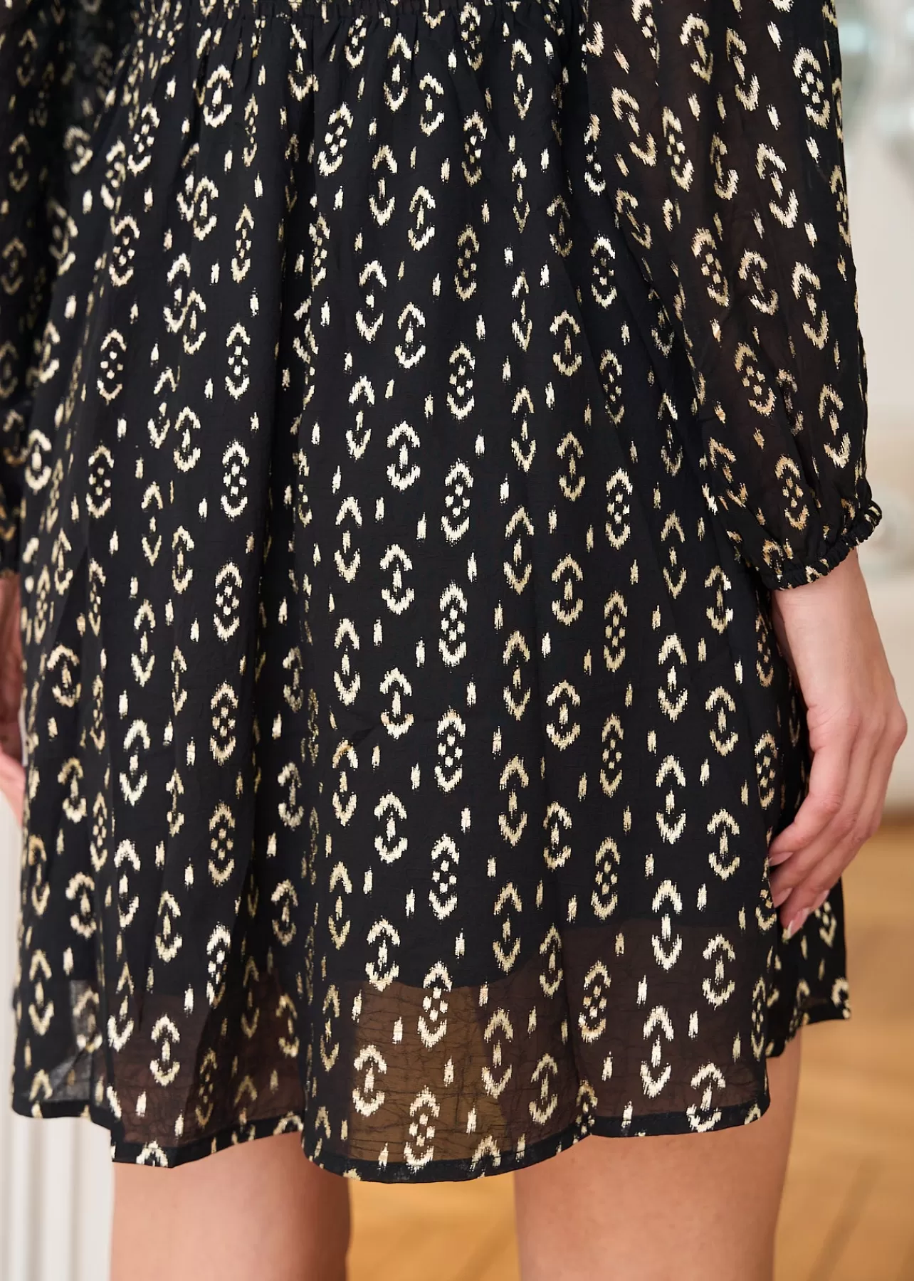 – Robe courte imprimée – Manches longues élastiquées – Encolure en V – Taille plissée u0026amp; élastiquée – Fil …