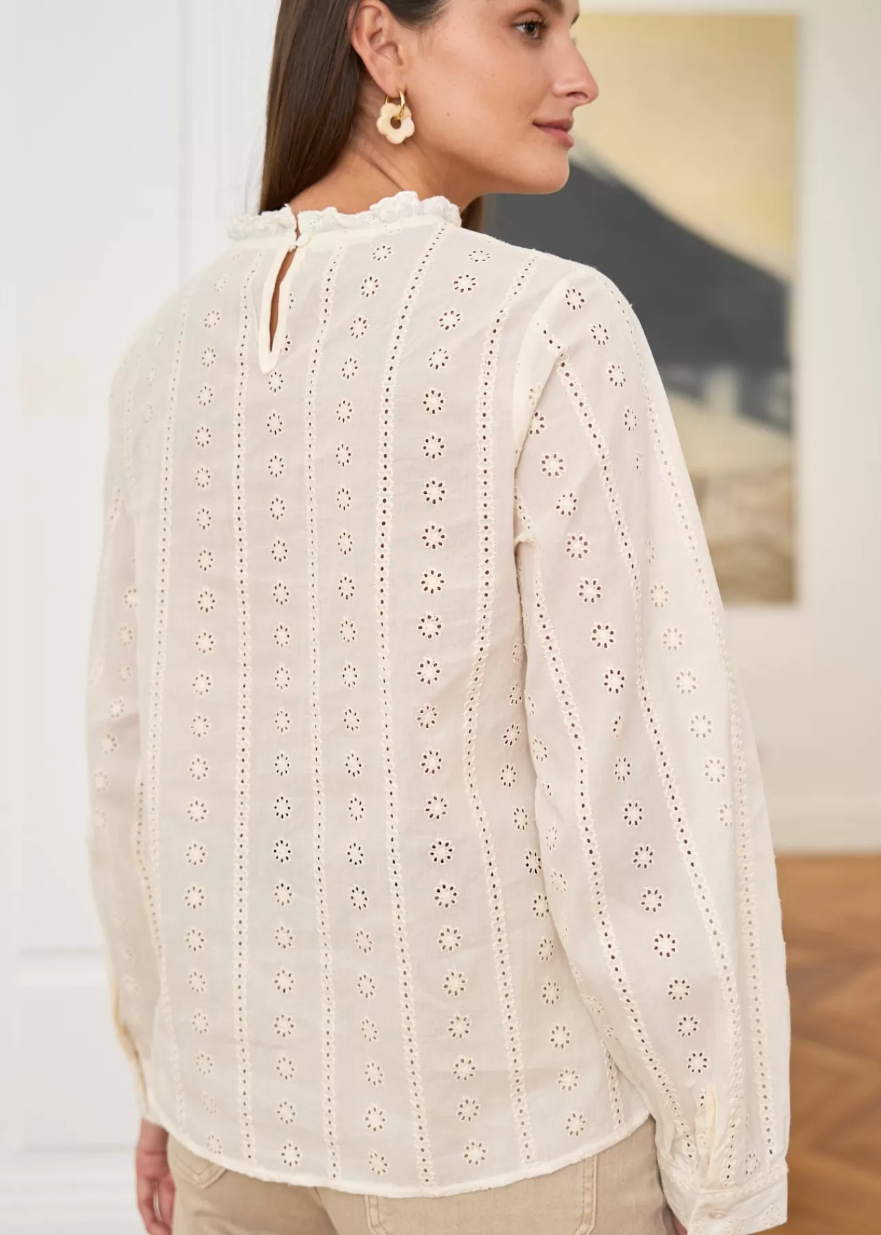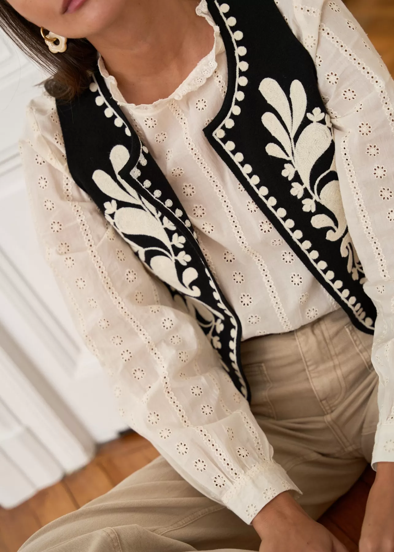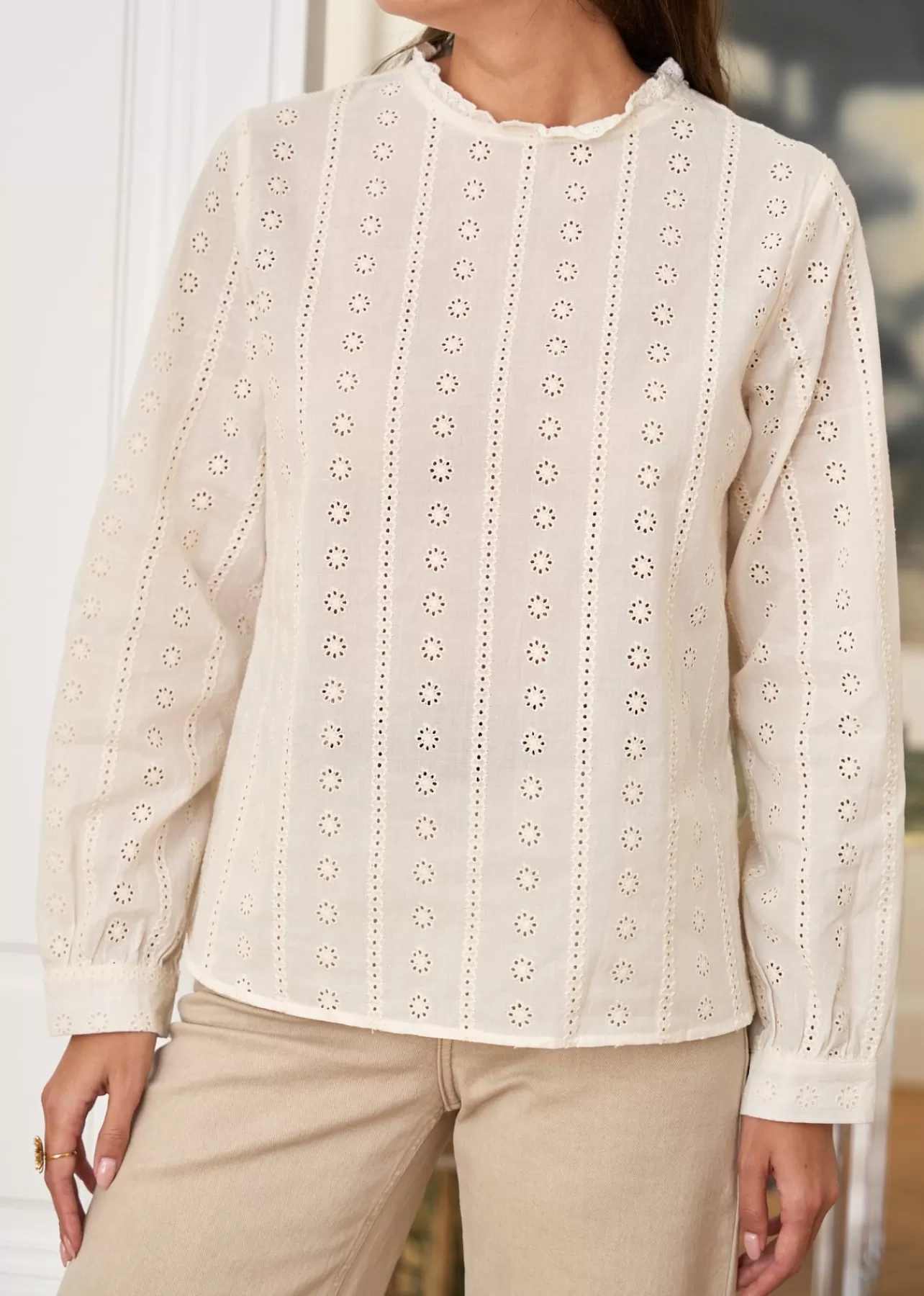 – Blouse brodée en coton – Manches longues – Col rond volanté – Ouverture goutte d’eau au dos – Longueur : 59 cm (S)…