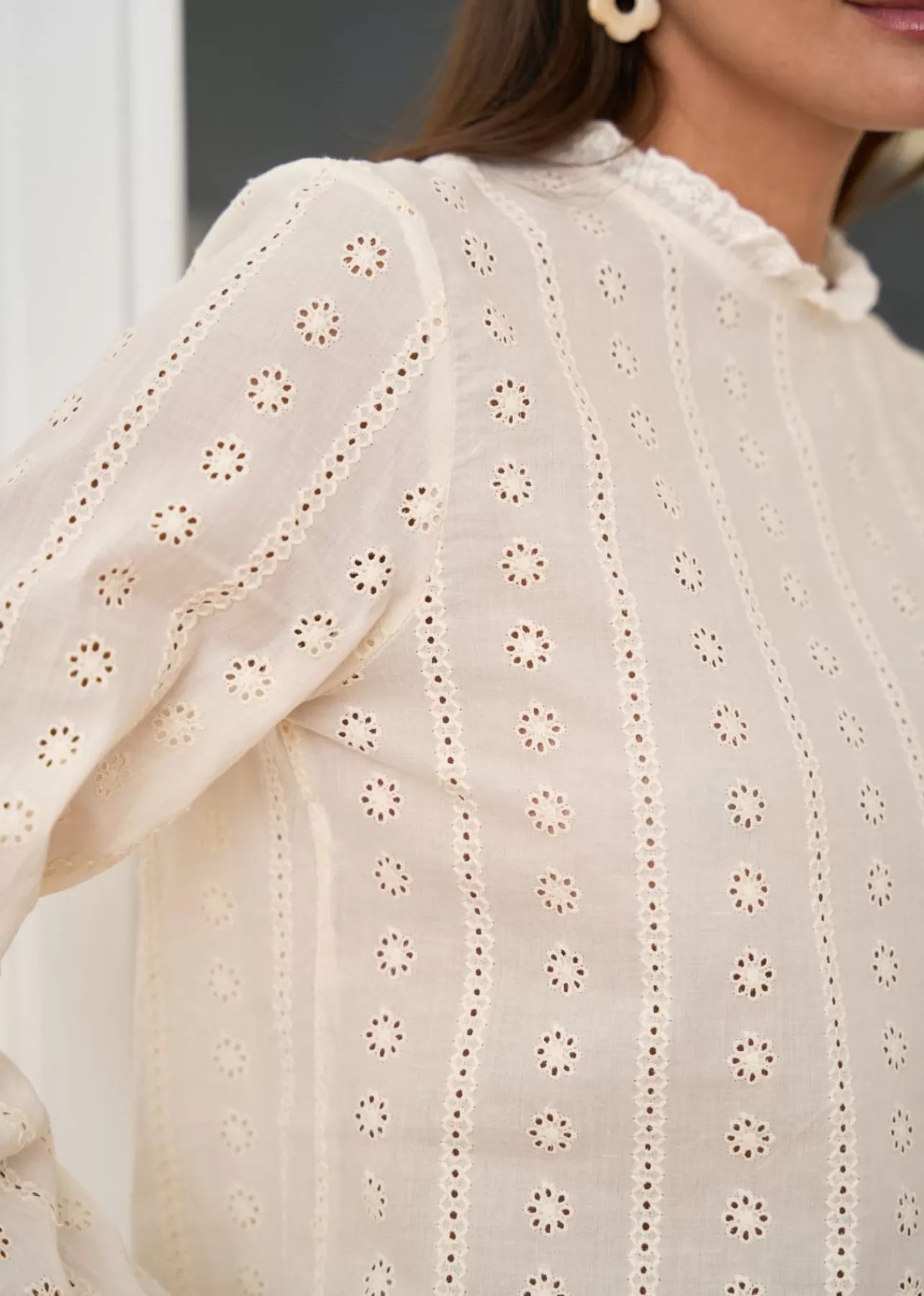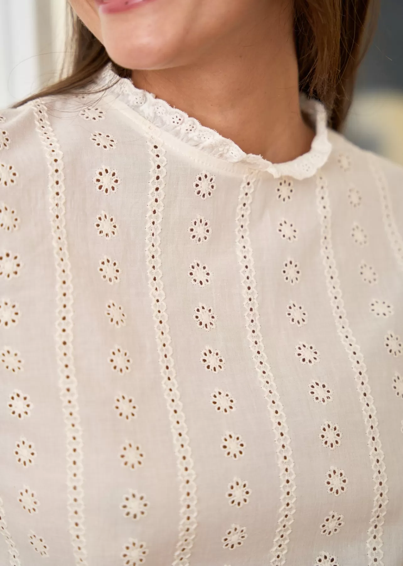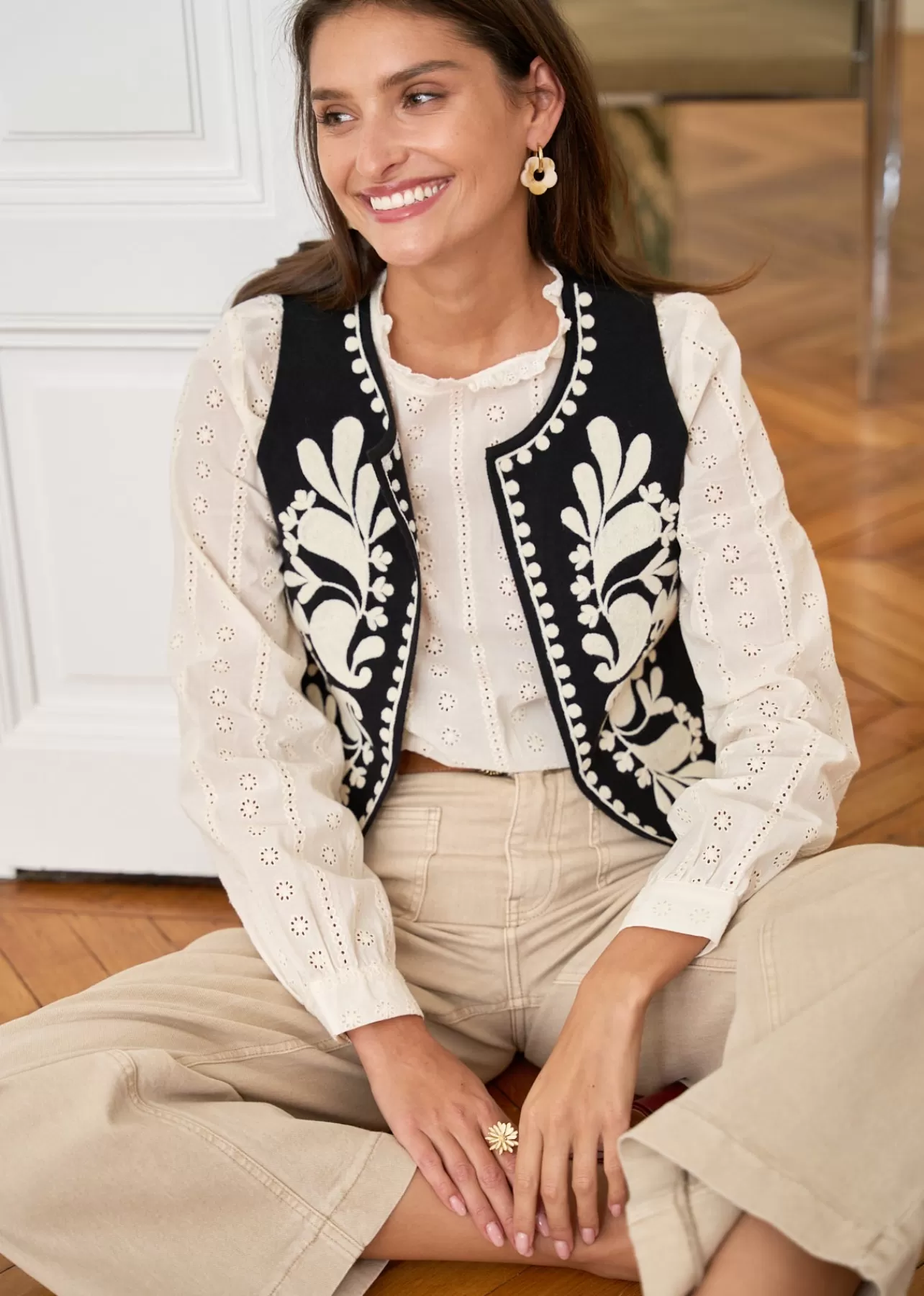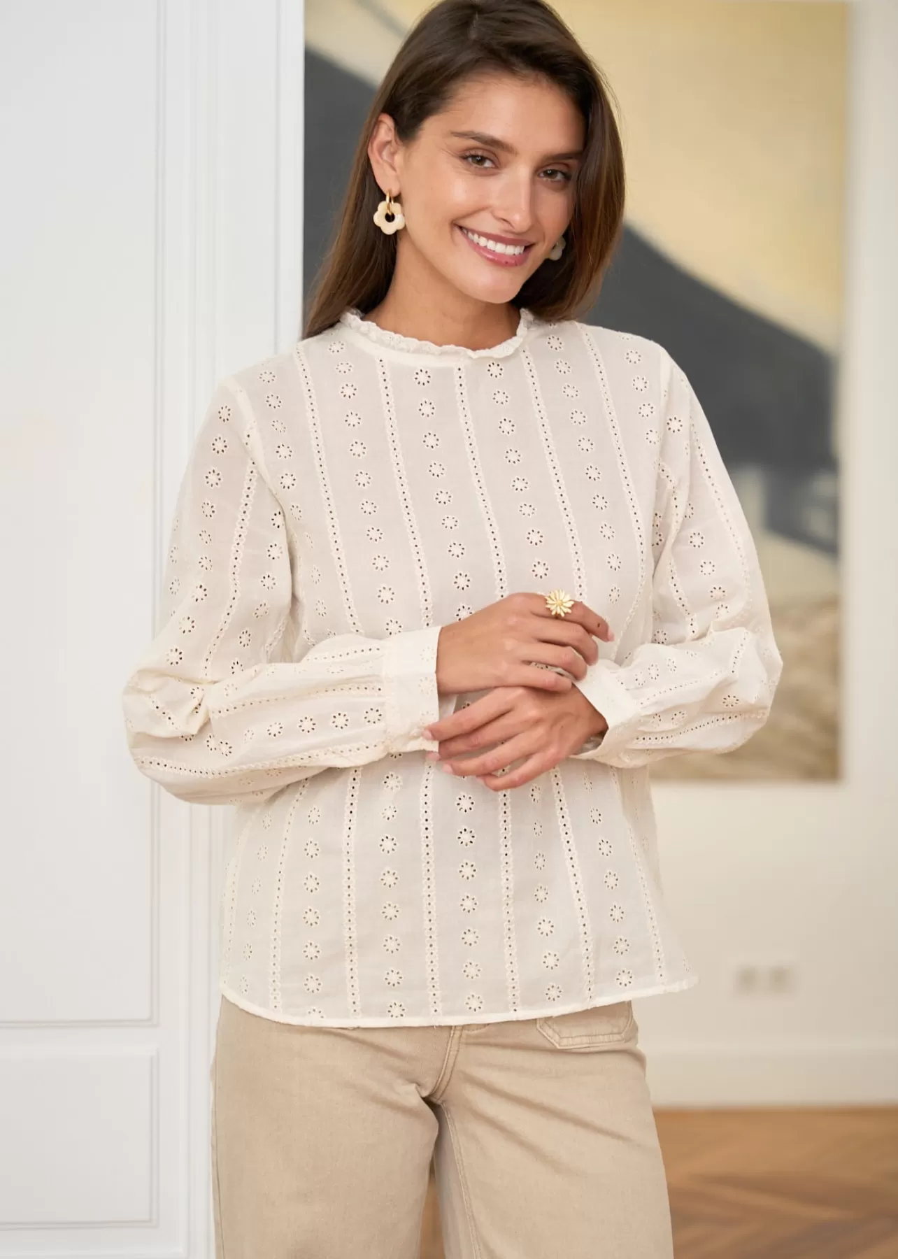 – Blouse brodée en coton – Manches longues – Col rond volanté – Ouverture goutte d’eau au dos – Longueur : 59 cm (S)…