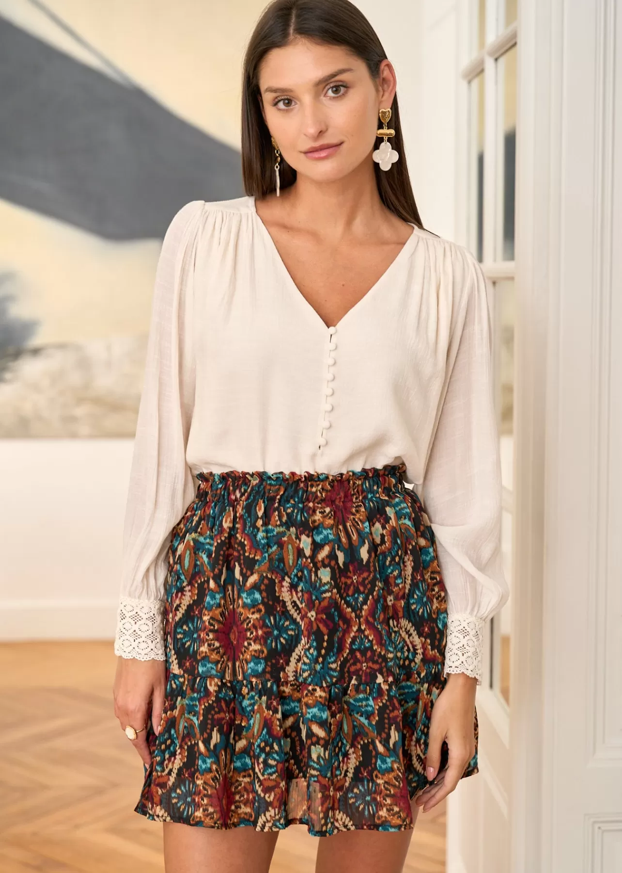 – Blouse manches longues – Col V – Patte de boutonnage au devant – Boutons recouverts – Bas des manches brodé – Doublé…