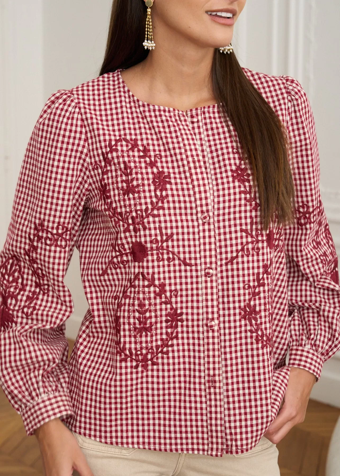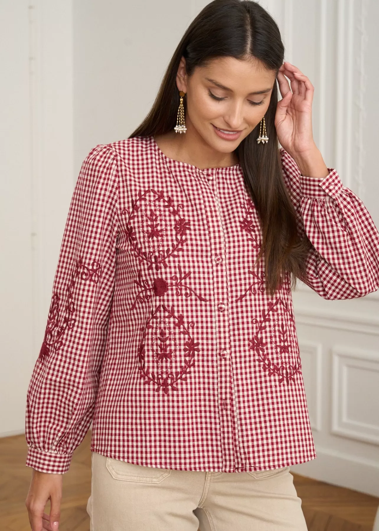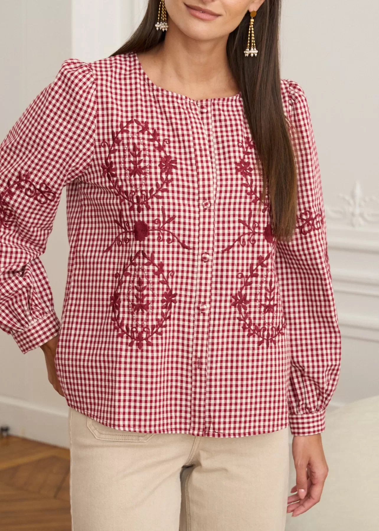 – Blouse imprimée en coton – Brodée au devant – Manches longues – Col rond – Patte de boutonnage au devant – Boutons…