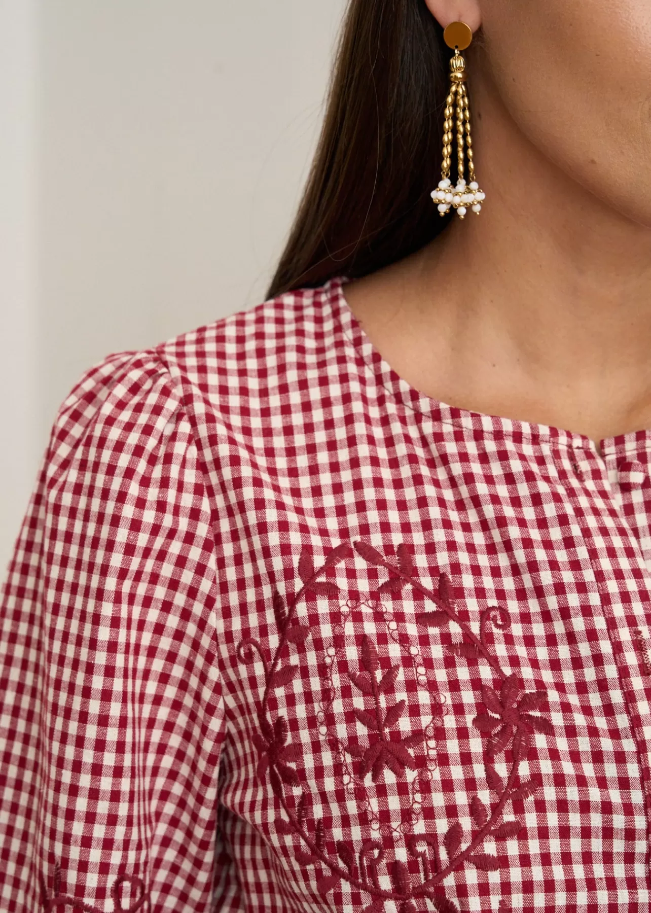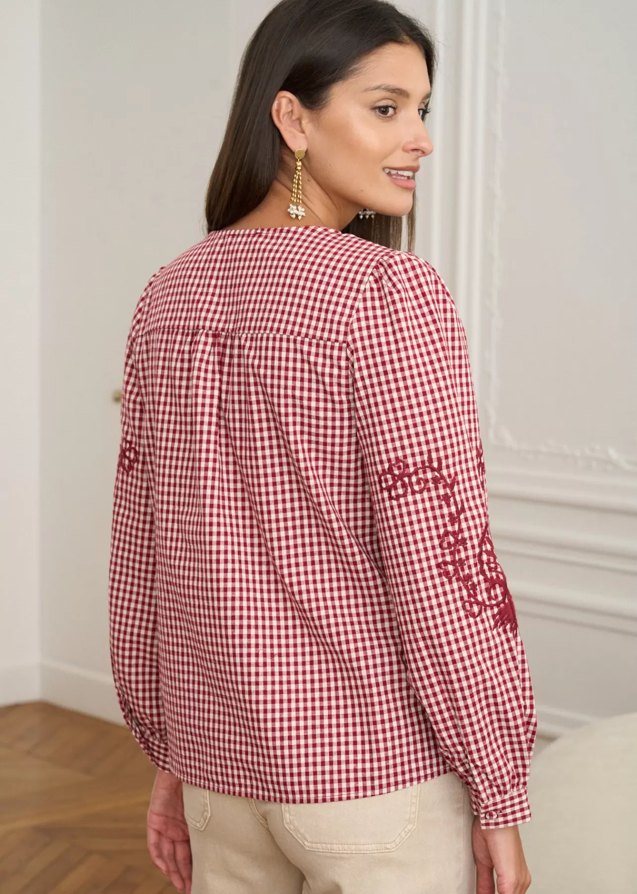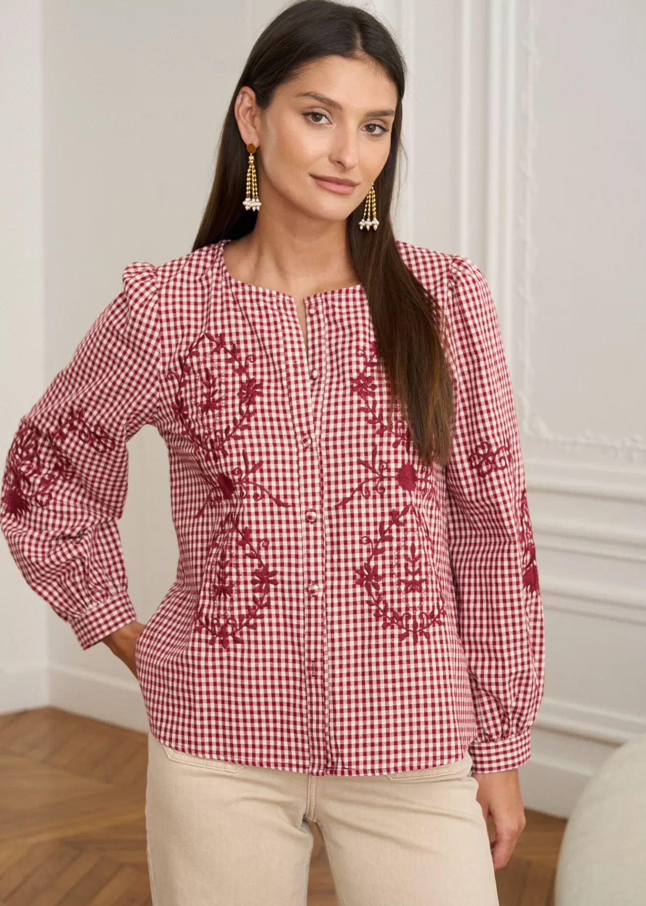 – Blouse imprimée en coton – Brodée au devant – Manches longues – Col rond – Patte de boutonnage au devant – Boutons…