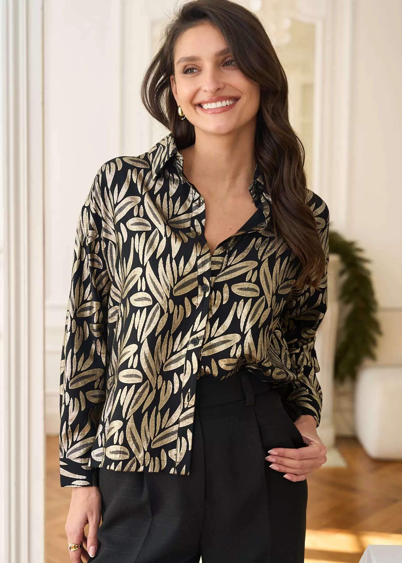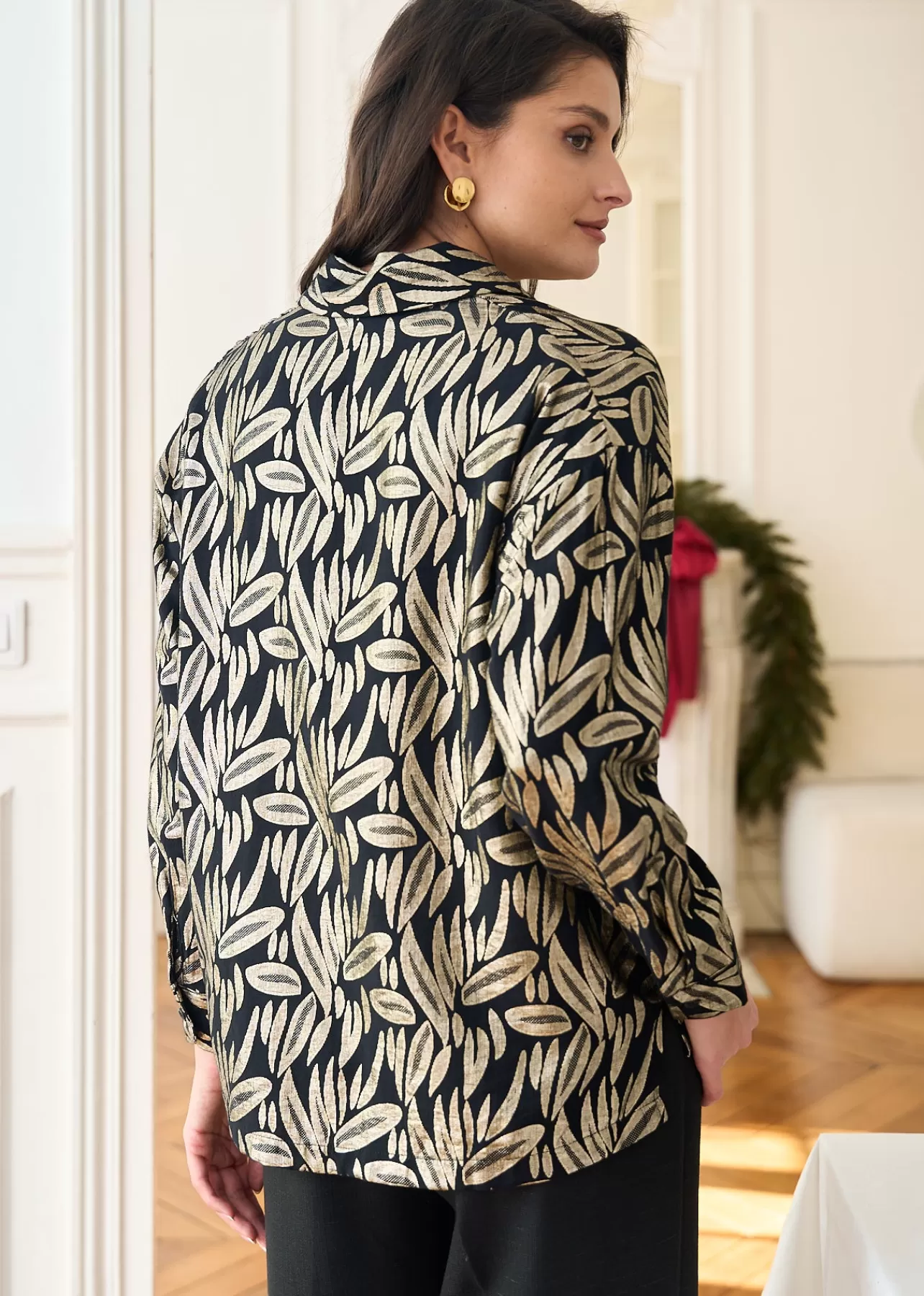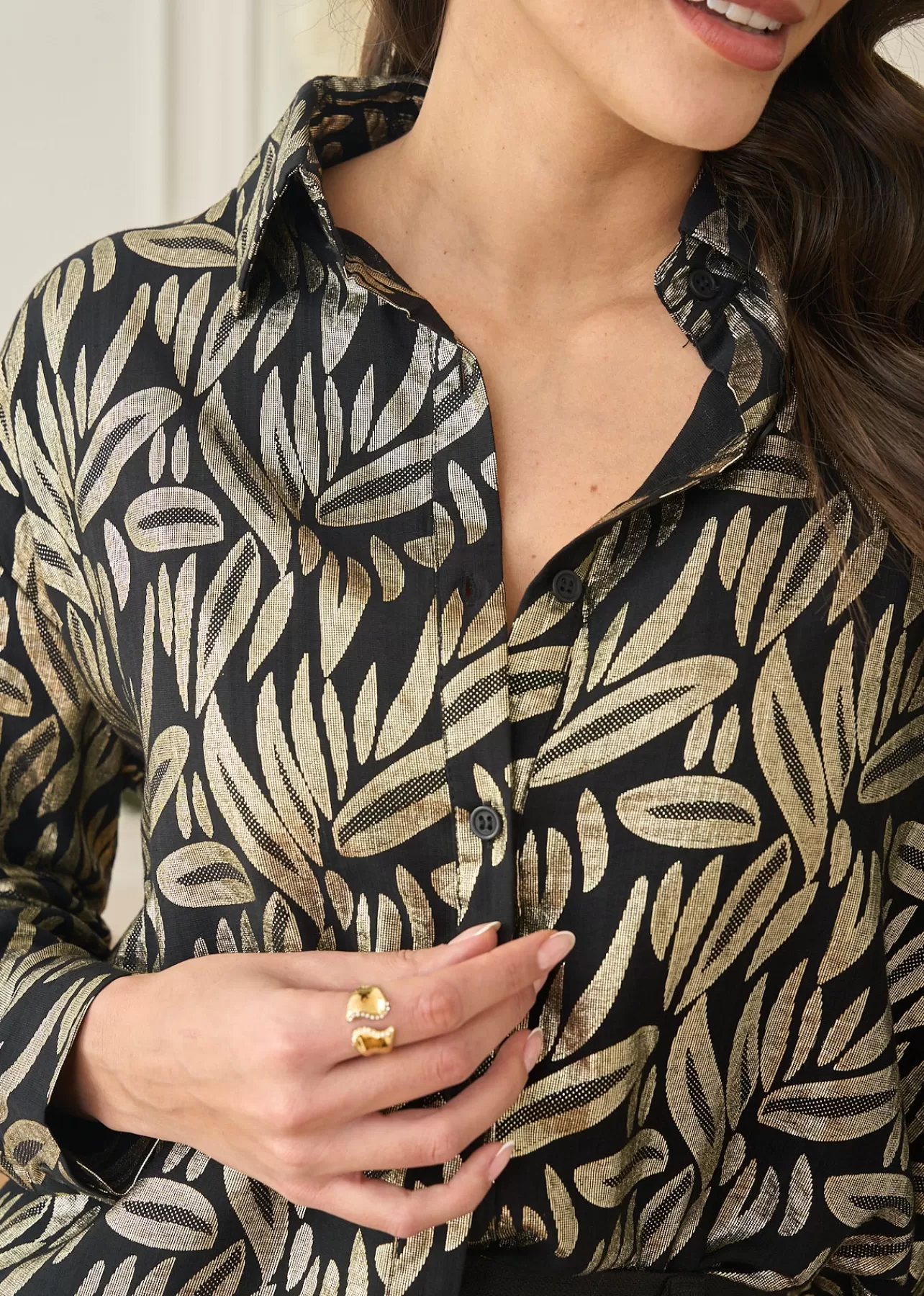 – Chemise imprimée en viscose – Lamé doré – Manches longues – Col classique – Patte de boutonnage au devant – Longueu…