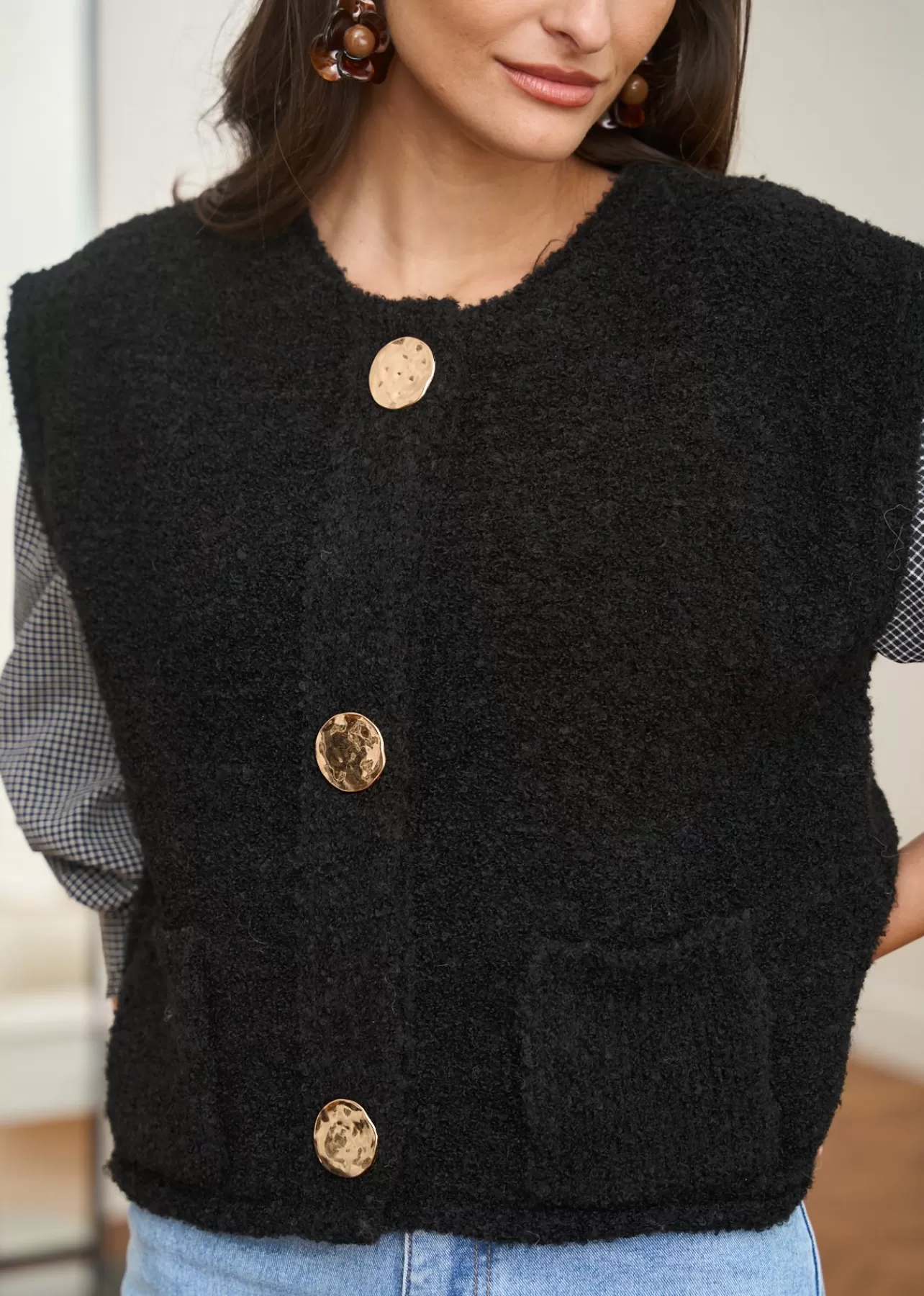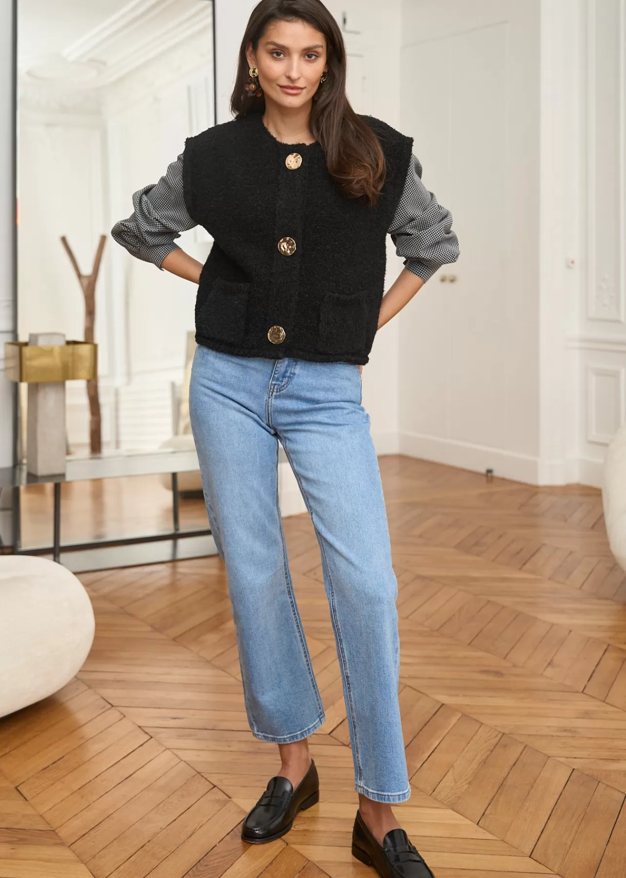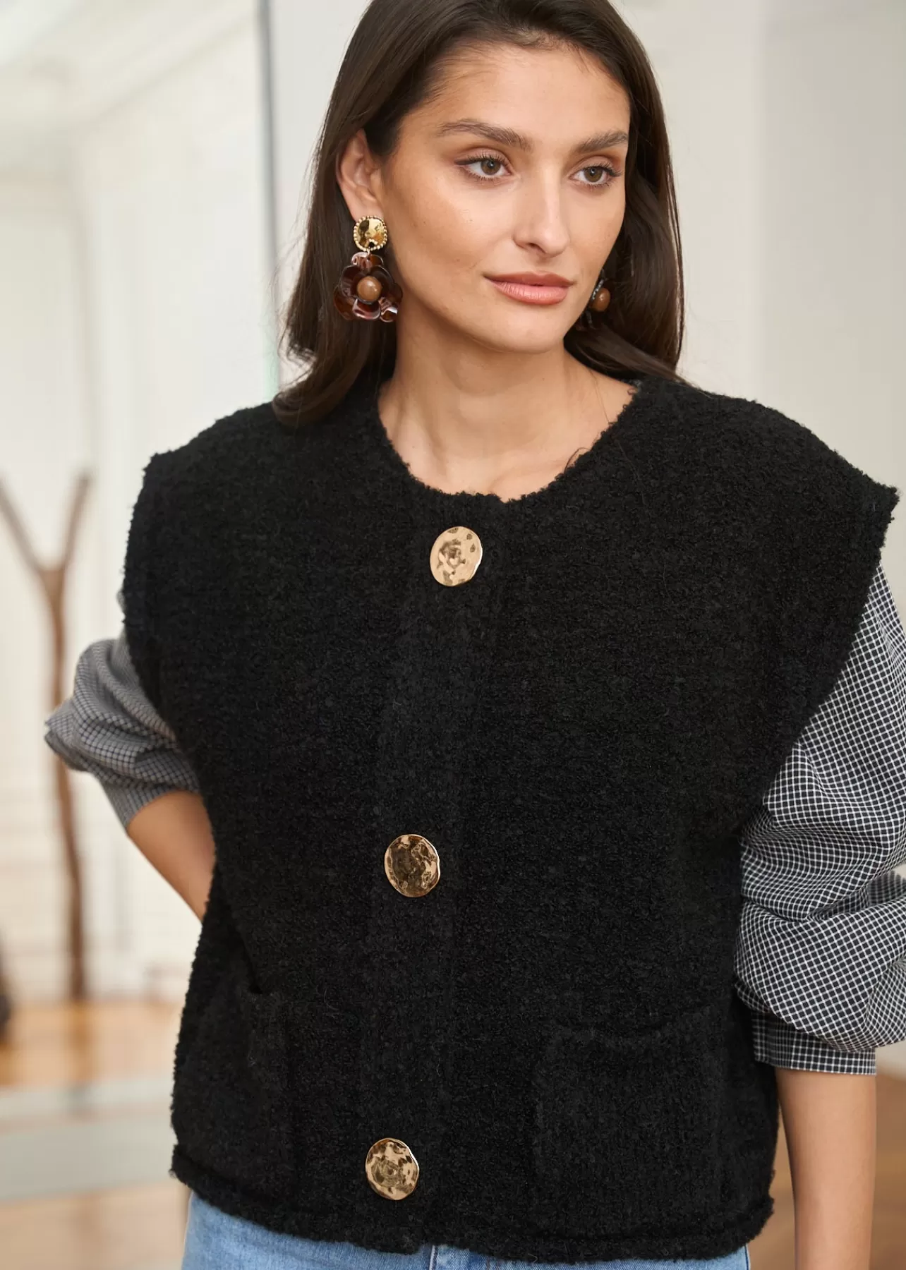 – Gilet sans manches – Col rond – Patte de boutonnage au devant – Boutons dorés – 2 poches plaquées au devant – Longue…