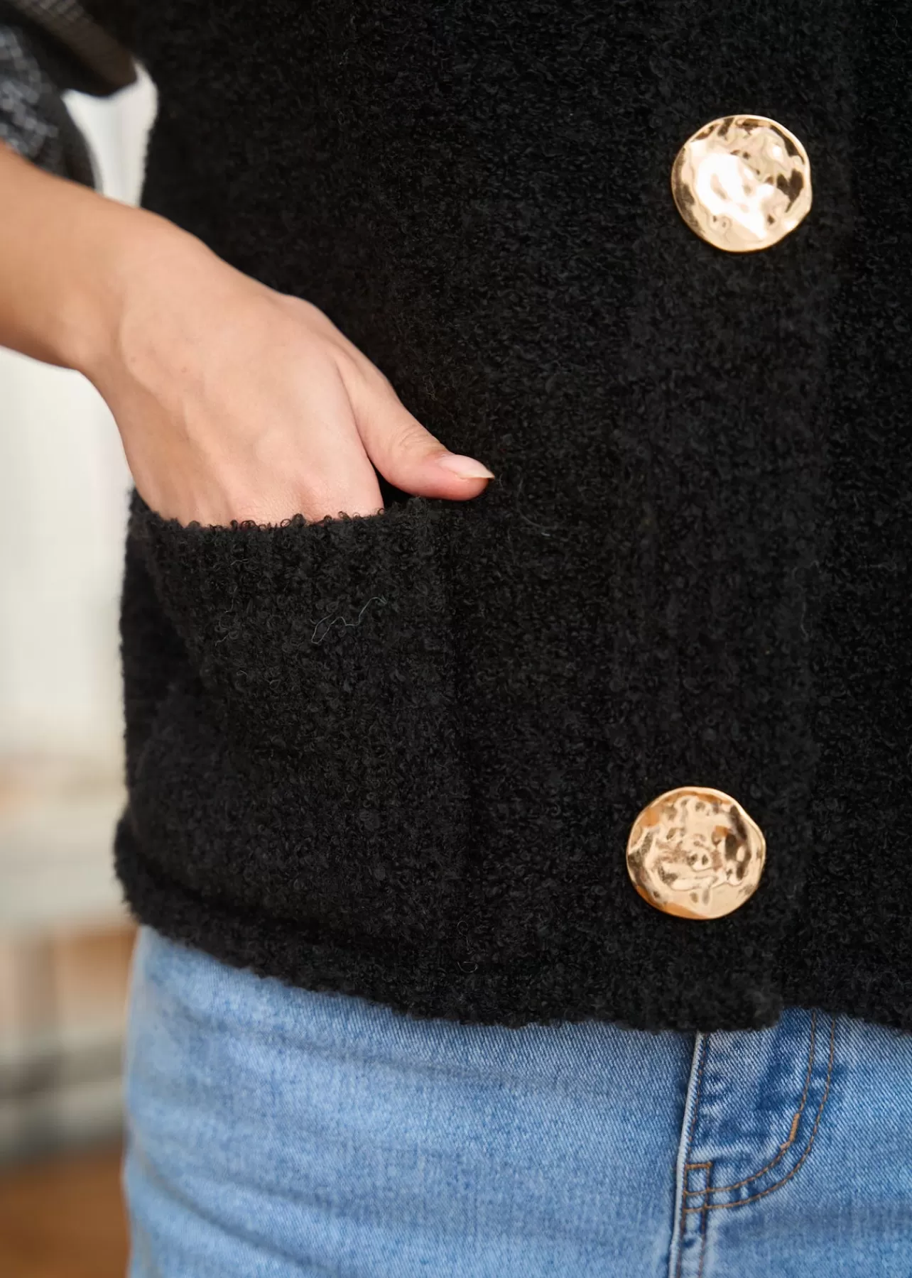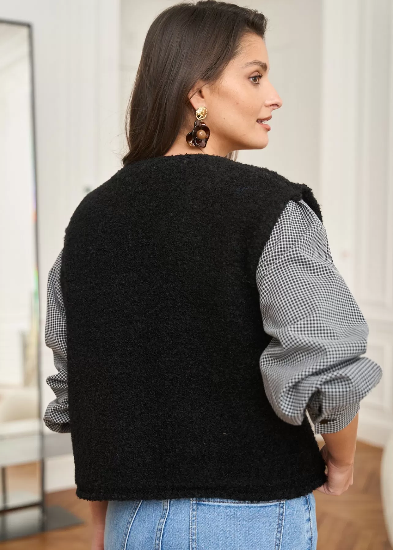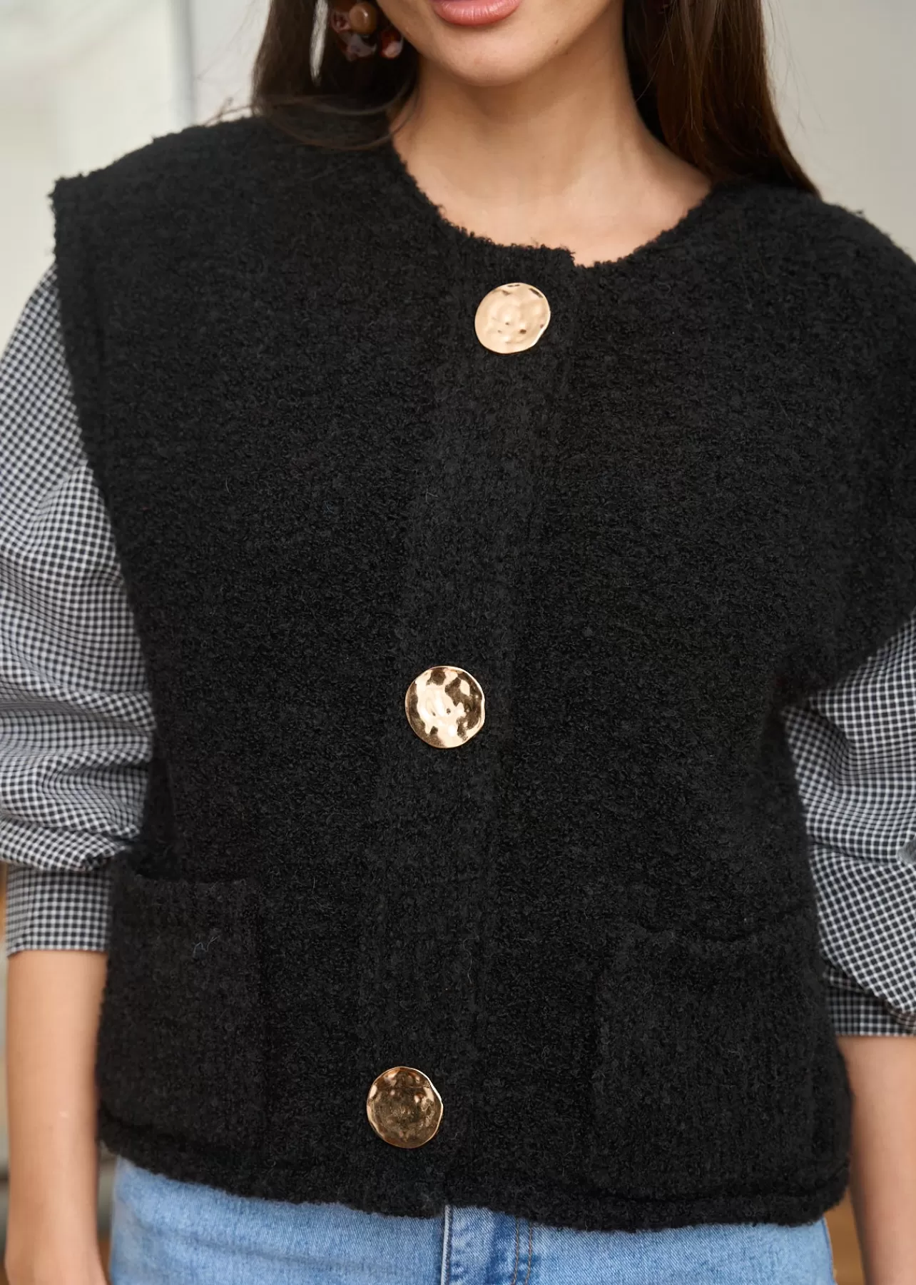 – Gilet sans manches – Col rond – Patte de boutonnage au devant – Boutons dorés – 2 poches plaquées au devant – Longue…