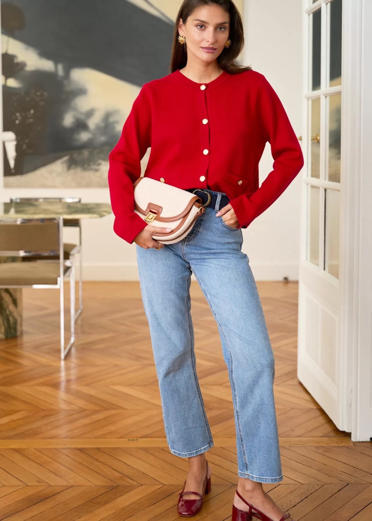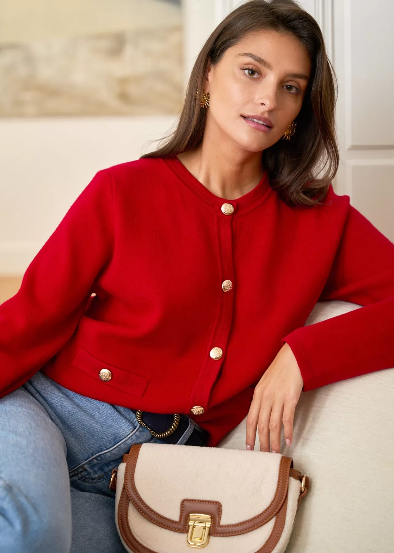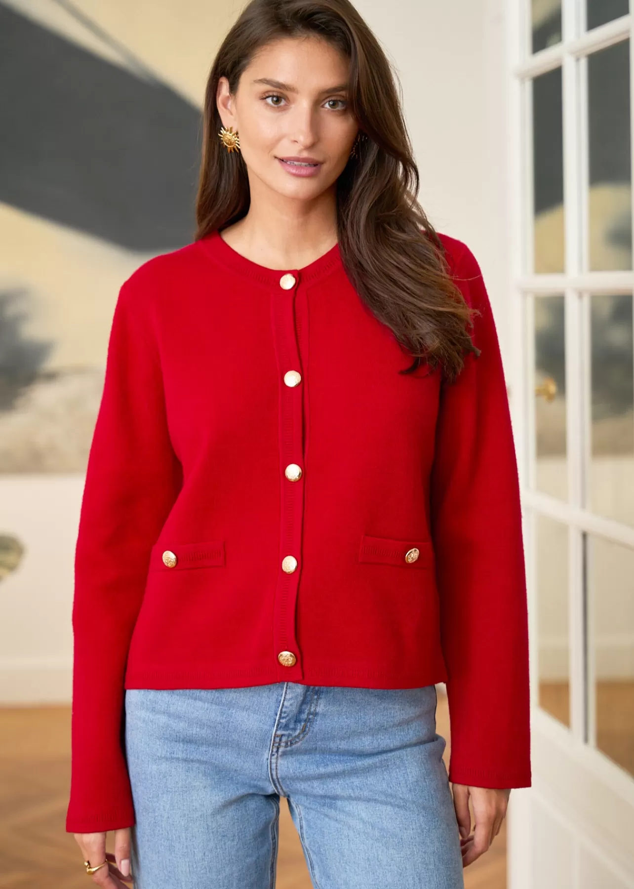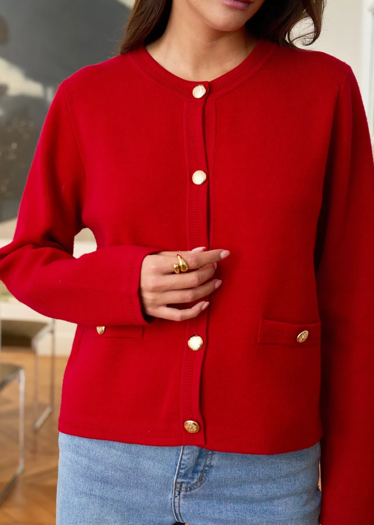 – Gilet manches longues en viscose – Patte de boutonnage à l’avant – Boutons dorés – 2 fausses poches plaquées a…
