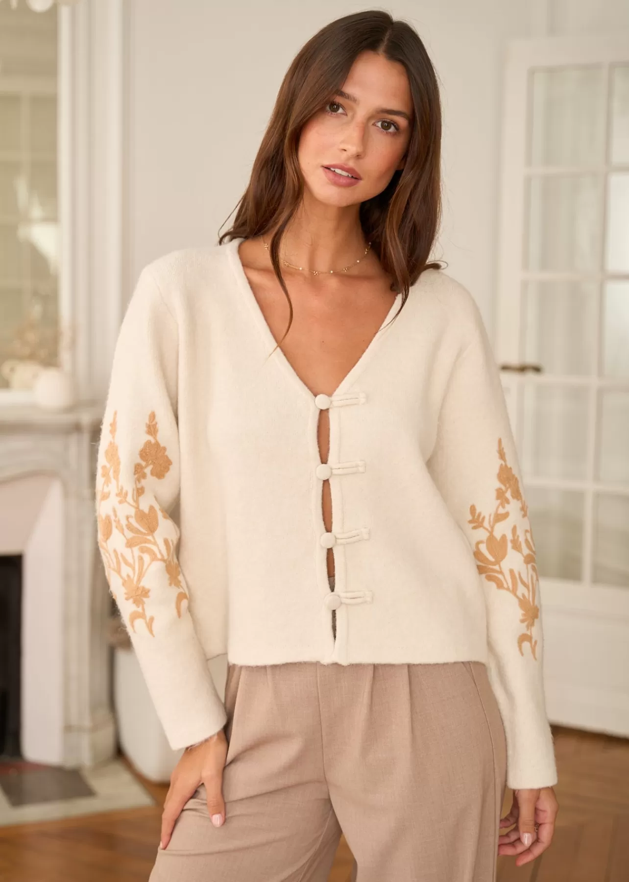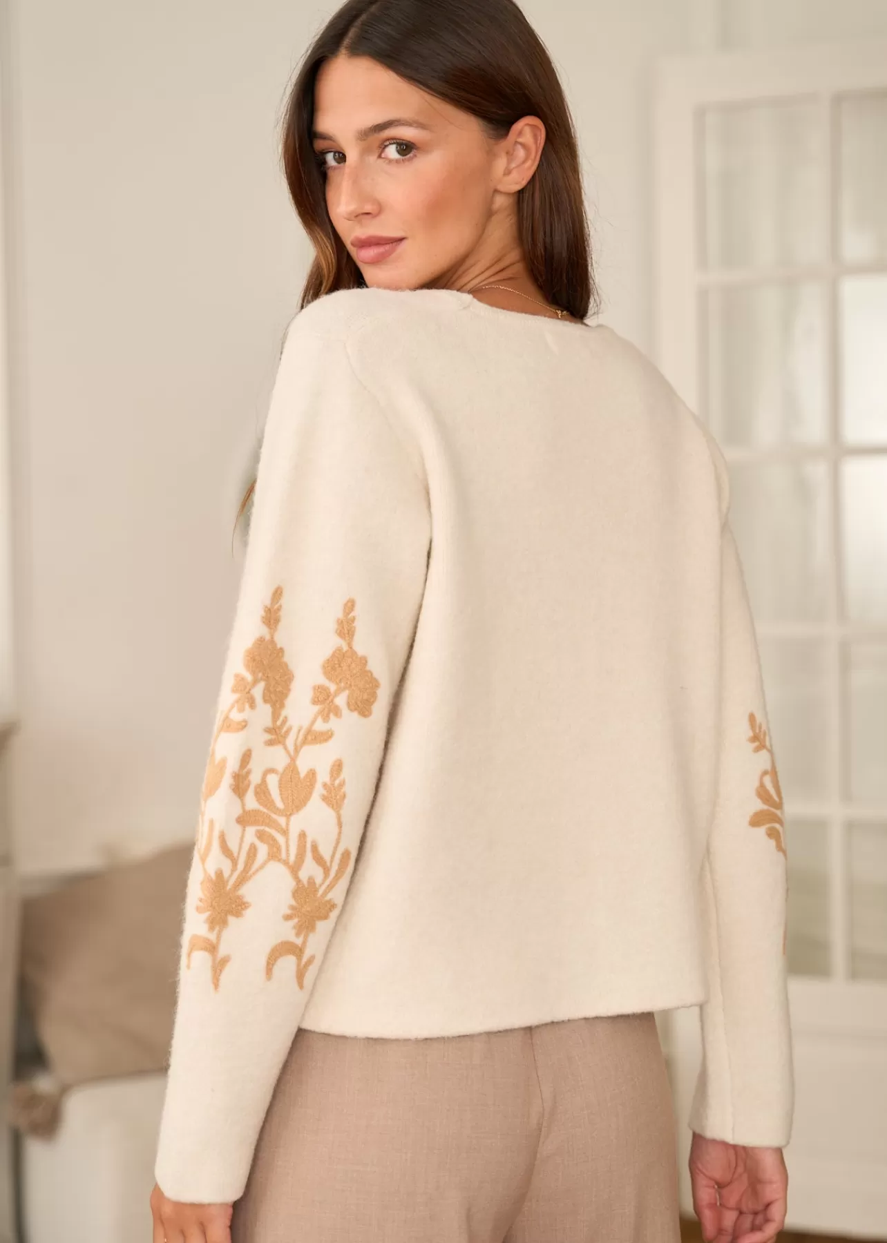 – Gilet brodé aux manches – Manches longues – Encolure en V – Patte de boutonnage à l’avant – Boutons recouverts -…