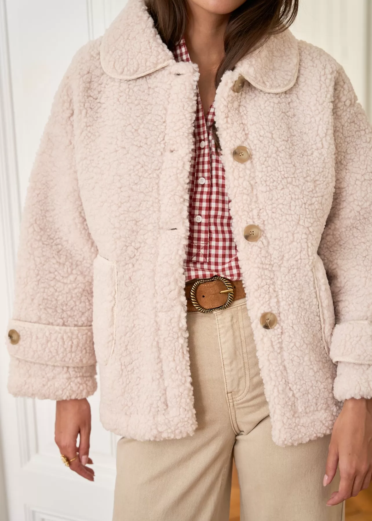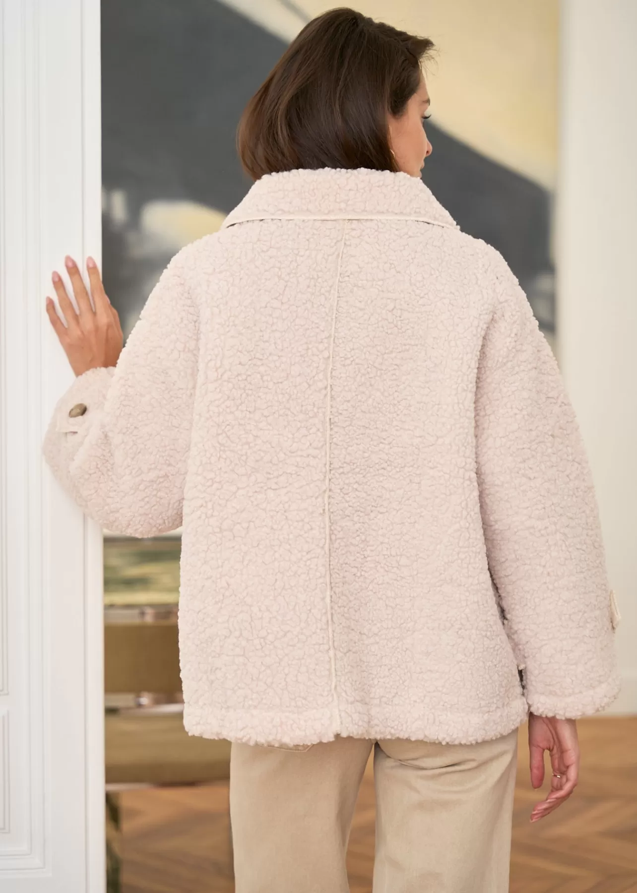 – Manteau effet mouton- Manches longues- Col claudine- Patte de boutonnage à l’avant- 2 poches plaquées …