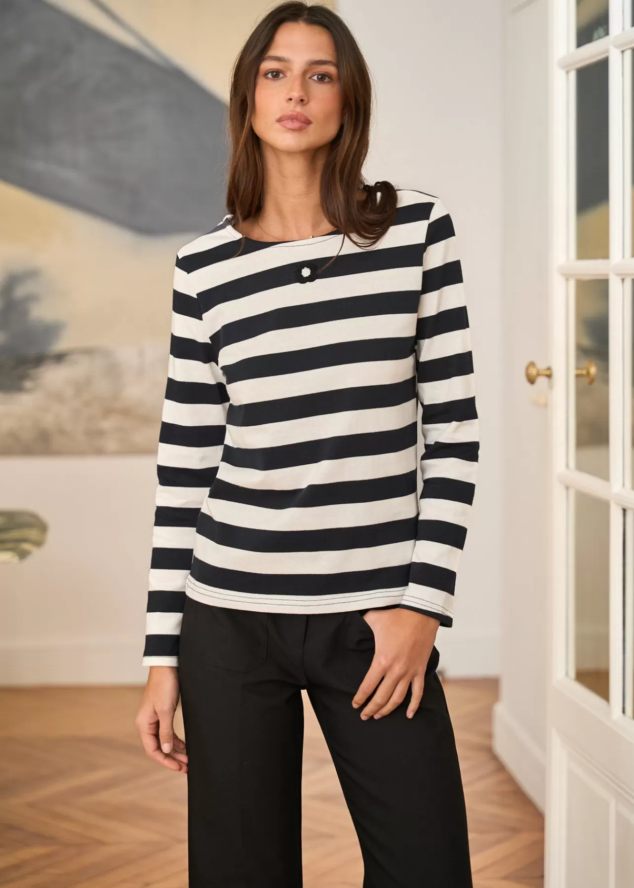 – Pull rayé en coton – Manches longues – Col rond – Fleur brodée au devant – Longueur : 57 cm (S) – Largeur : 43 cm Yo…