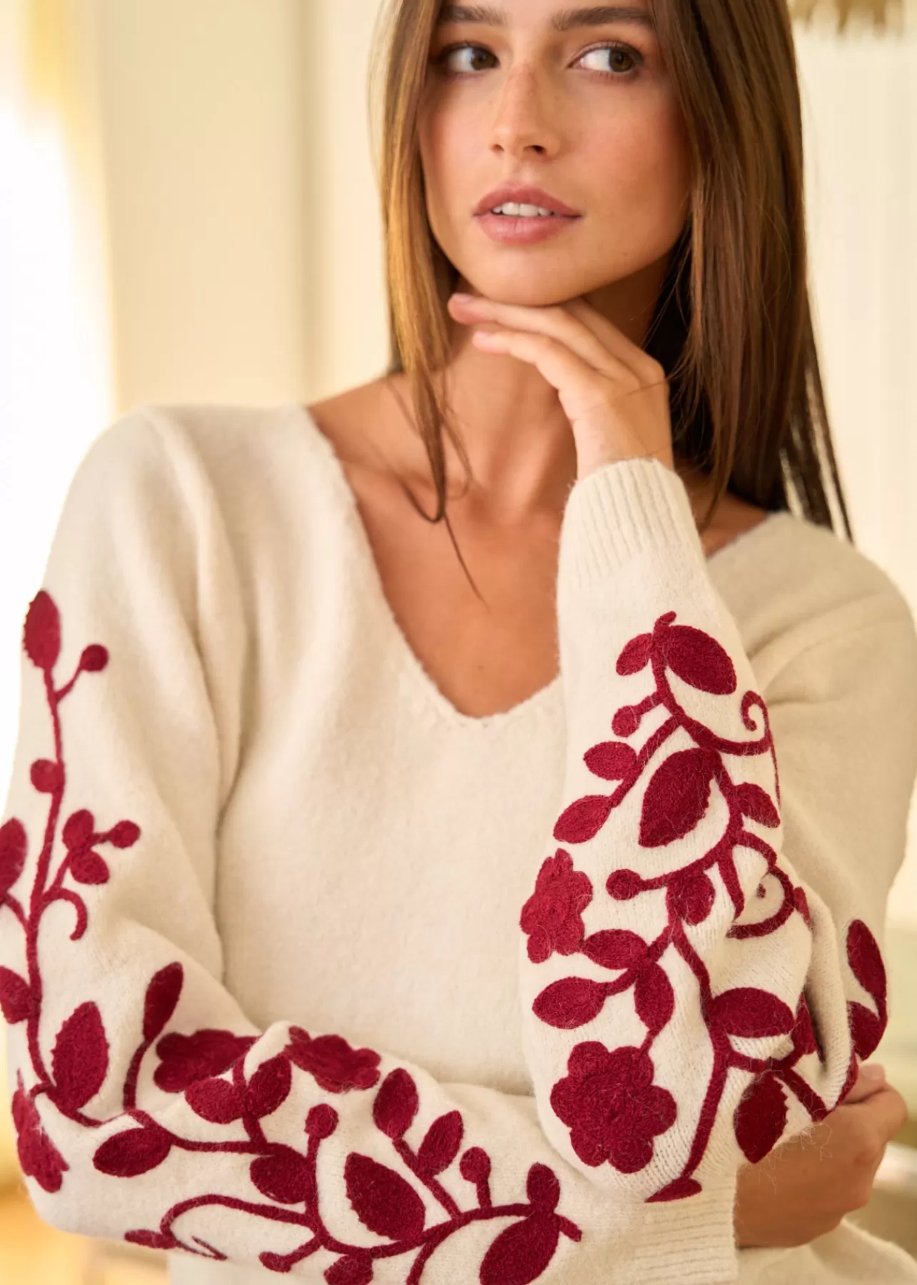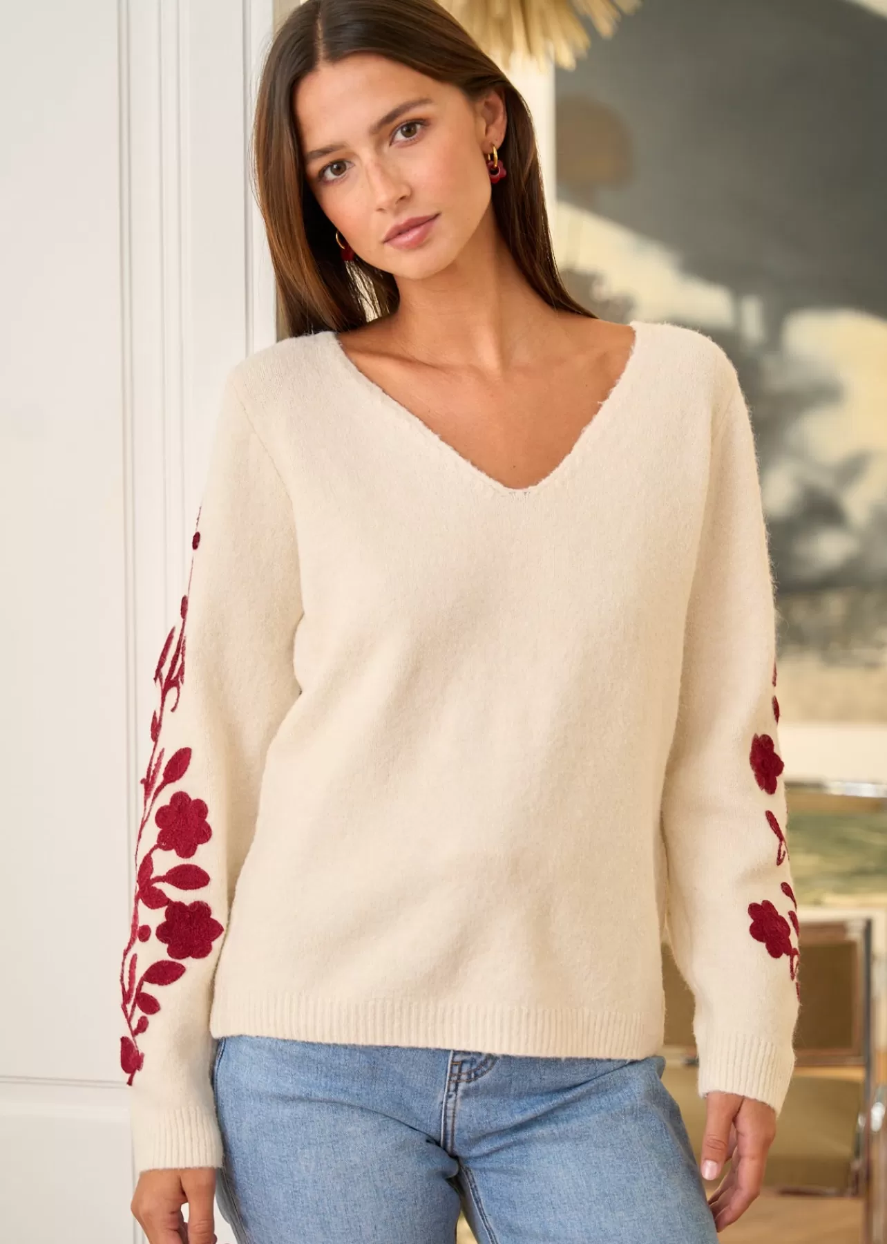 – Pull manches longues – Col V – Brodé aux manches – Longueur : 60 cm (T.U) – Largeur : 51 cm Youlia mesure 1m76 et po…