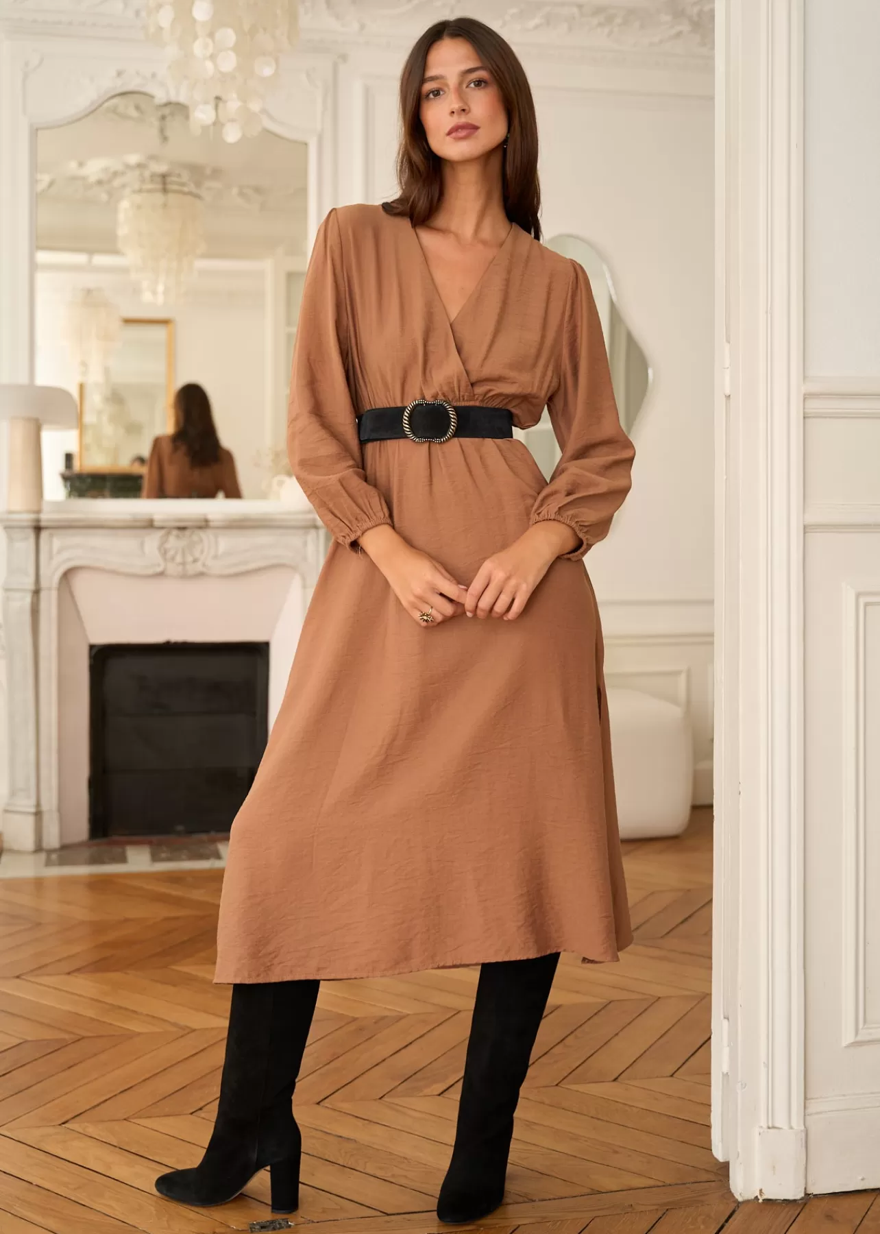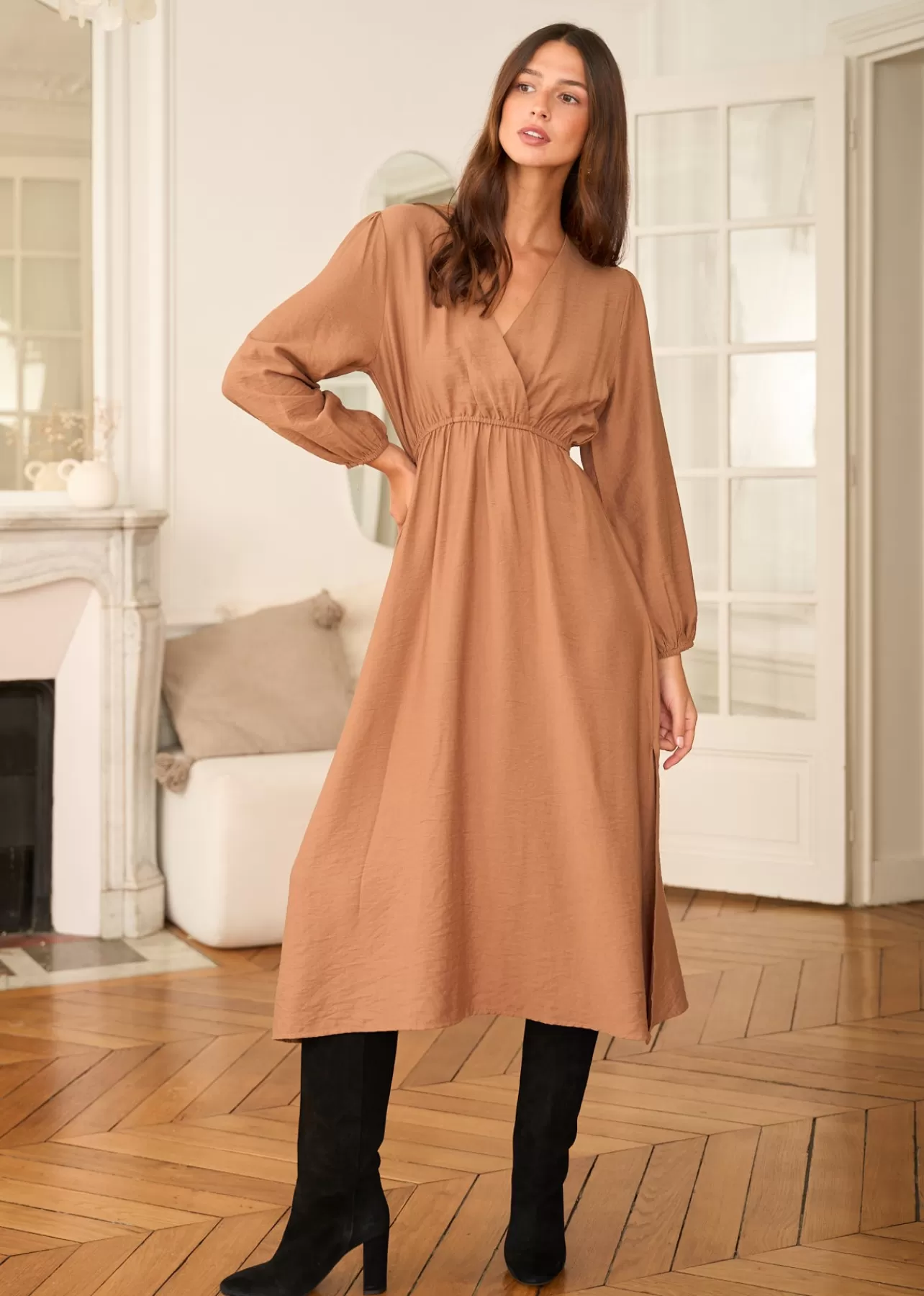 – Robe longue en viscose – Manches longues – Col cache coeur – Elastiquée à la taille et aux manches – Fendue au bas…