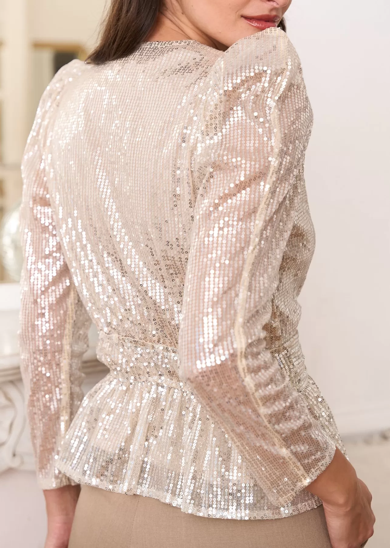 – Top en sequins – Manches longues- Col cache coeur – Plissé u0026amp; élastiqué à la taille – Epaules bouffantes -…