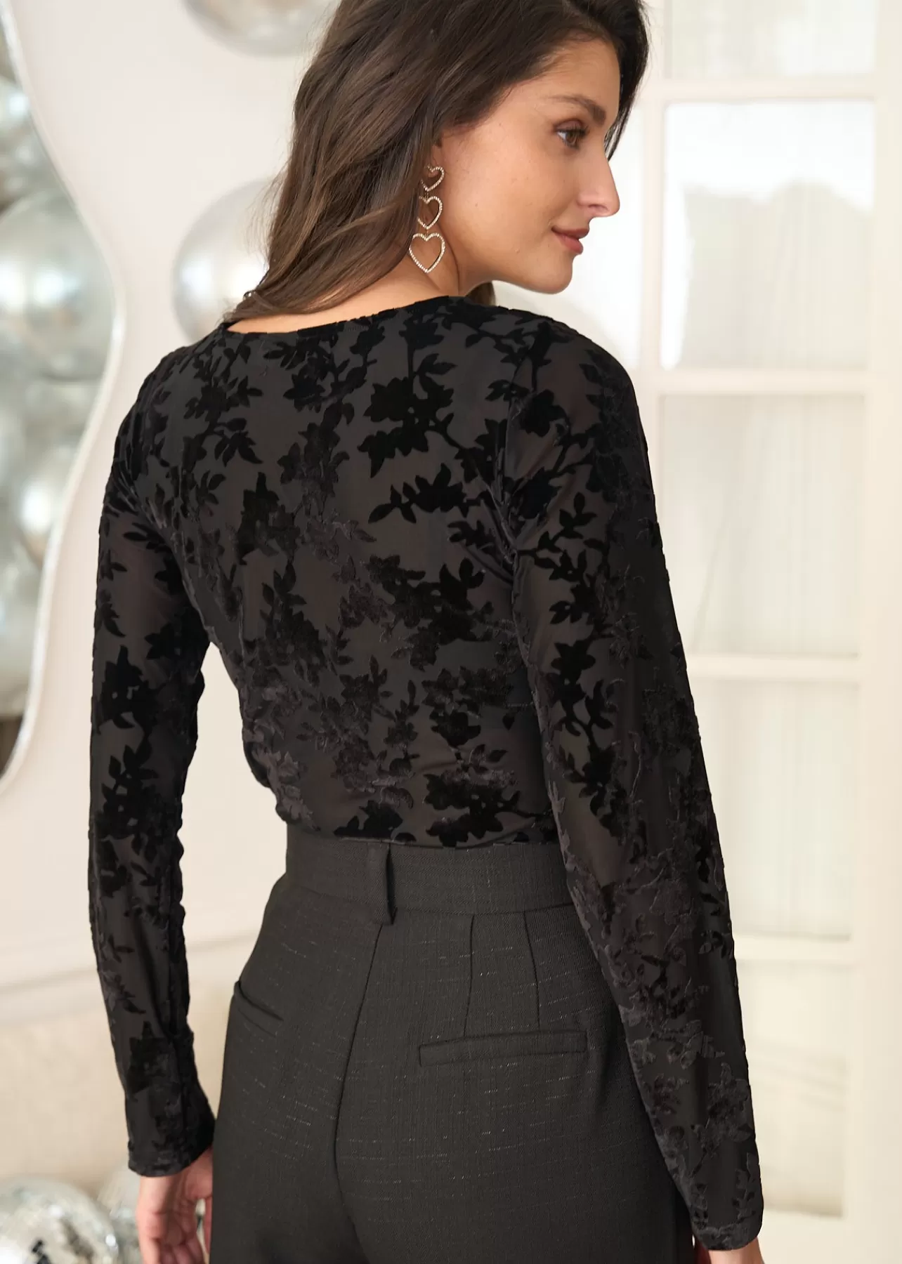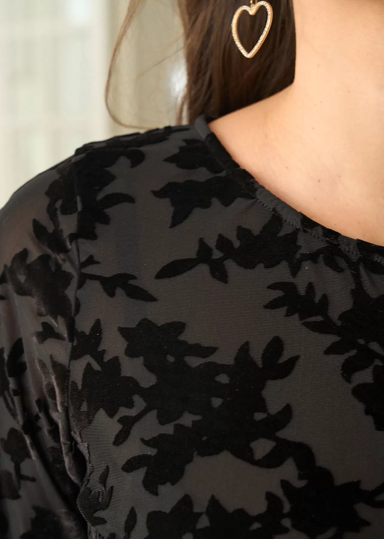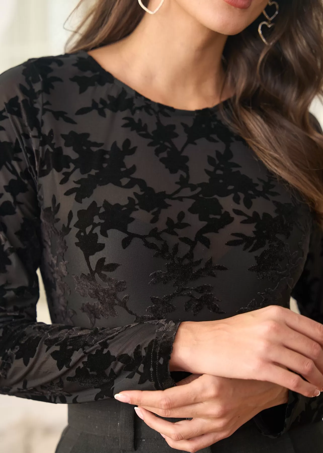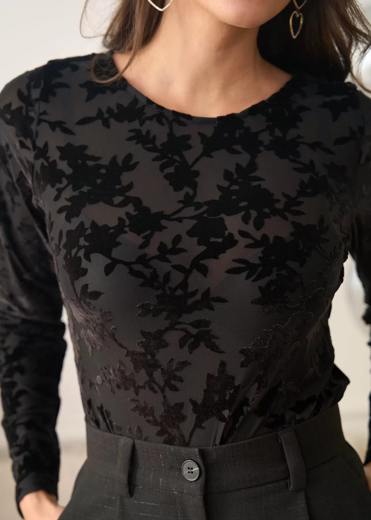 – Top manches longues – Col rond – Détails en velours – Tissu élastique – Tissu légèrement transparent – Longueur : …