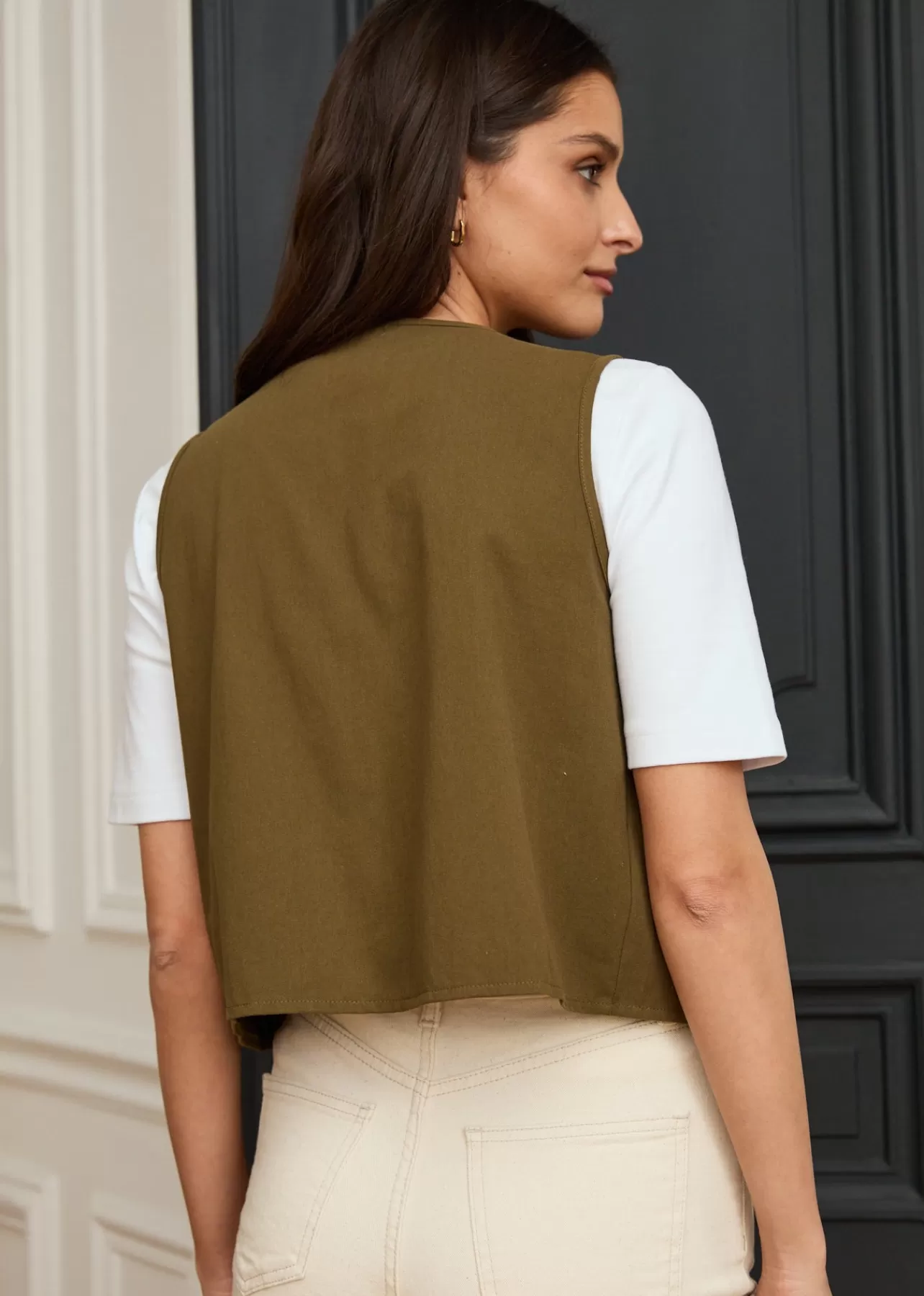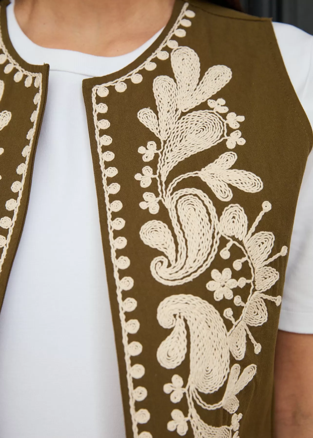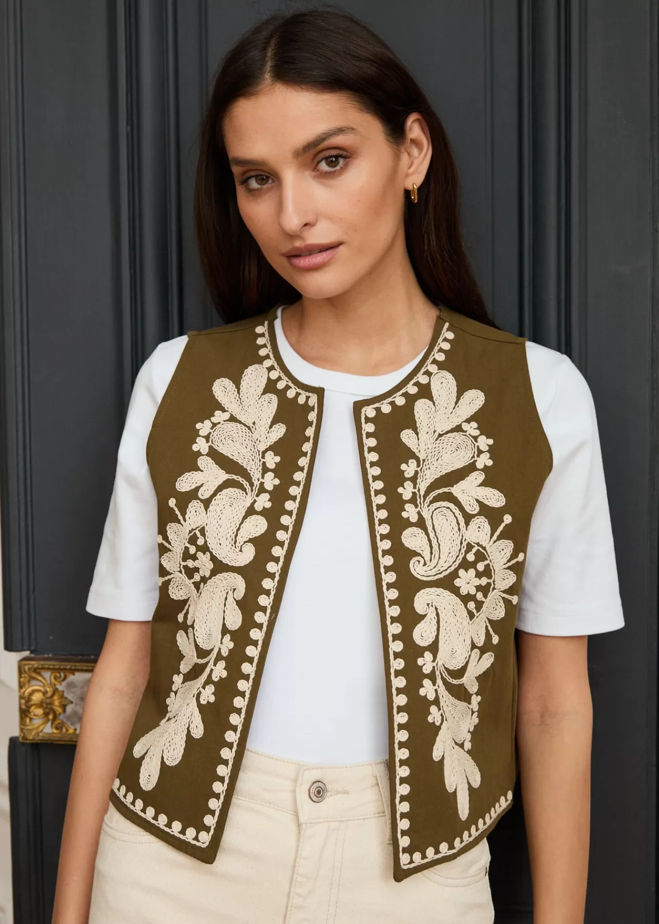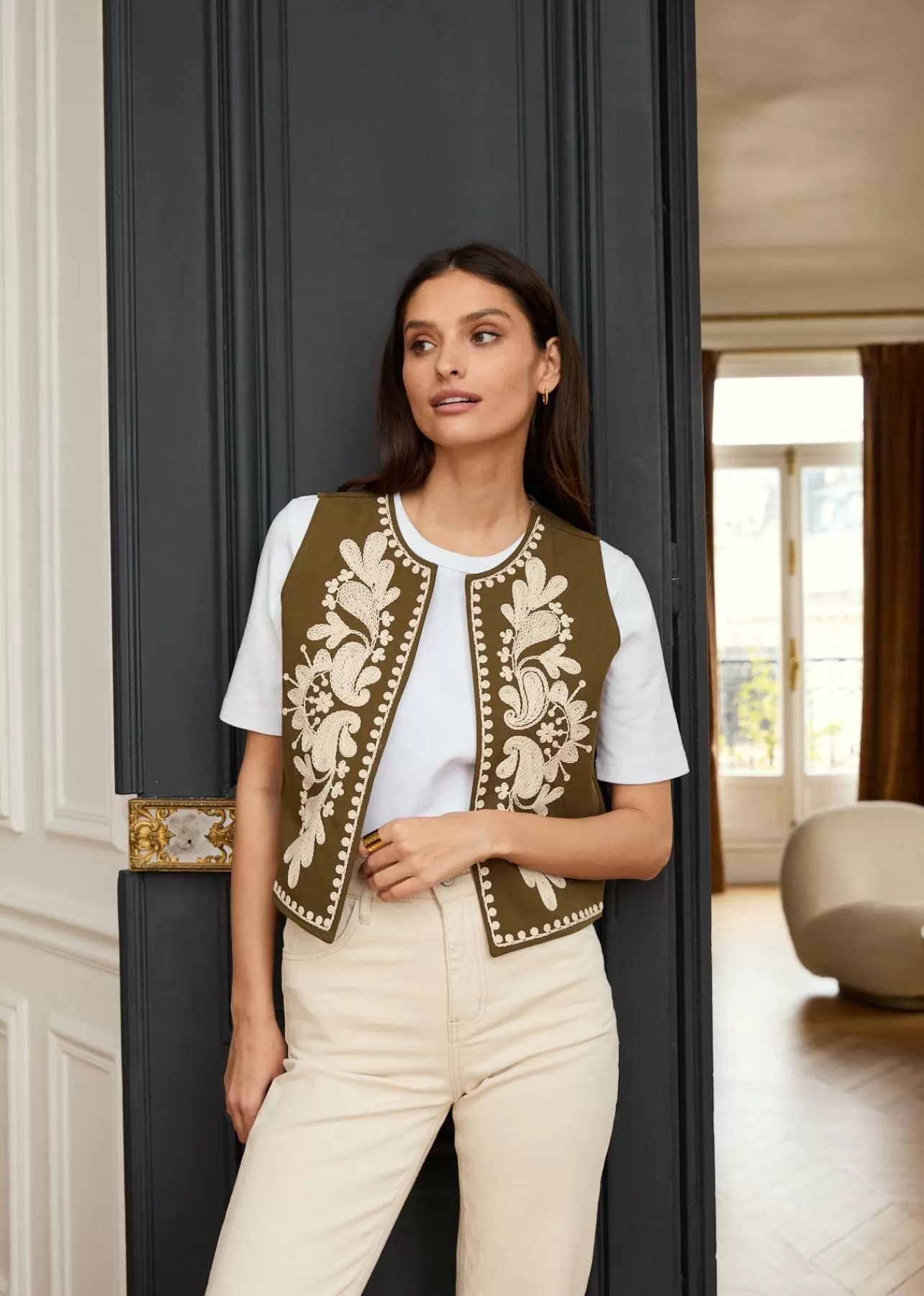 – Gilet sans manches- Brodé sur le devant- Col rond- Coupe droite et courte- Longueur : 47 cm (S)- Largeur…